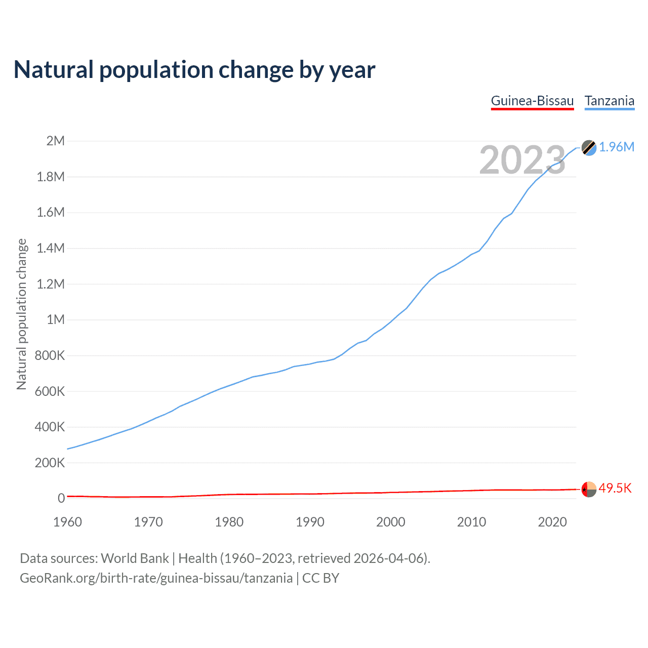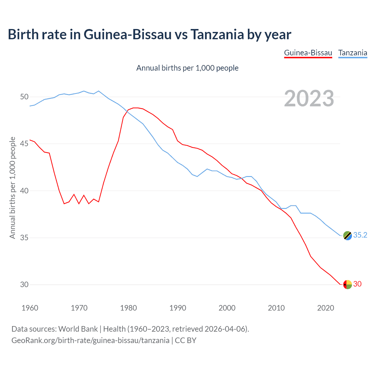 Guinea-Bissau has an annual birth rate of 30 births per 1,000 people, compared to 35.2 for Tanzania. The average number of children a woman is expected to have during her lifetime — the fertility rate, is 3.84 in Guinea-Bissau and 4.61 in Tanzania — 20.1% difference.
