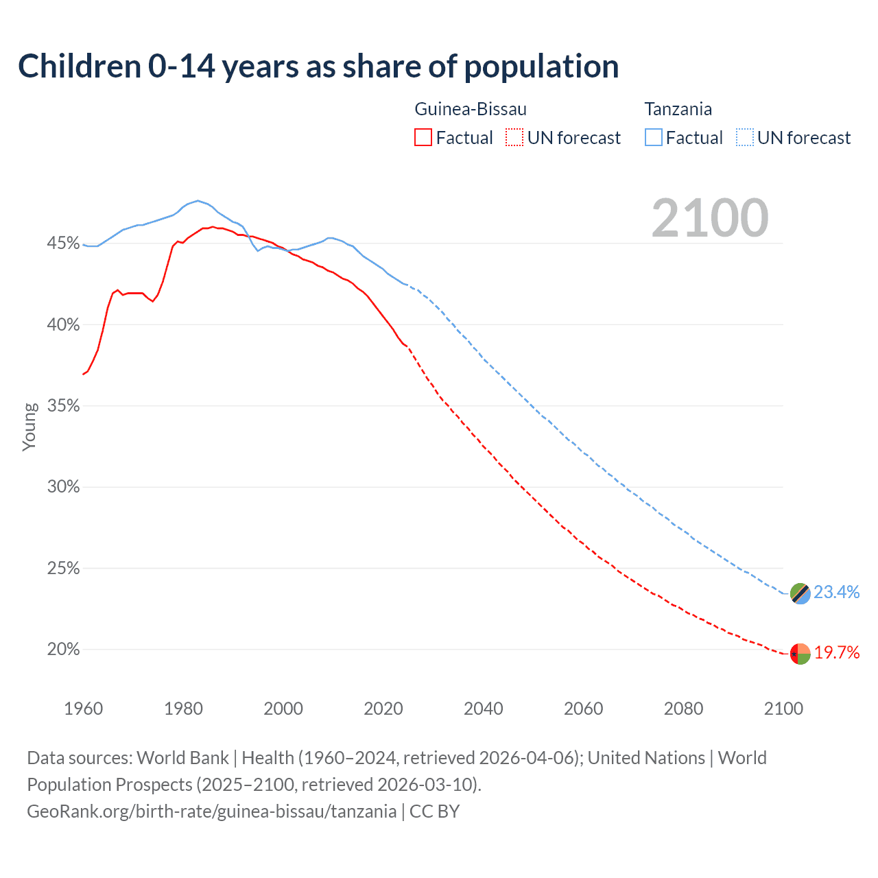According to the latest available data on birth rates, the fertility rate in Guinea-Bissau was 3.84 children per woman in 2023, compared to 4.61 in Tanzania in 2023. The replacement level is considered to be 2.1 children per woman.