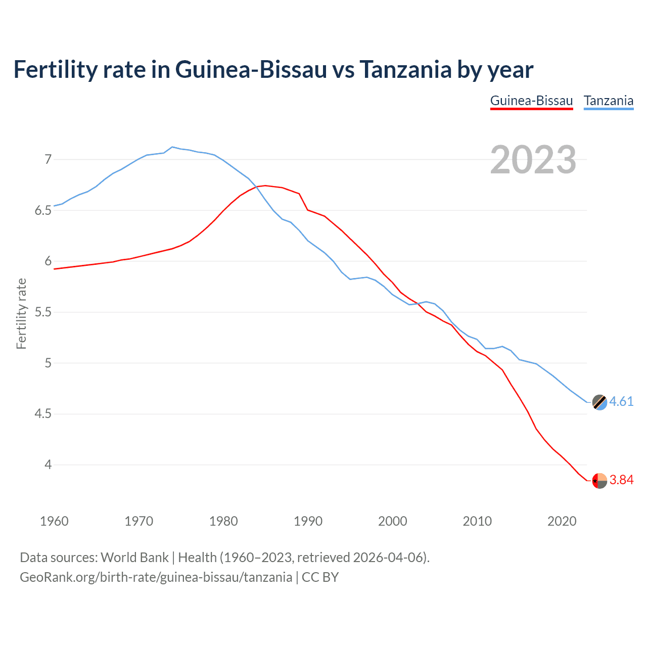 1960 vs 2023, the fertility rate has decreased by 35.2% in Guinea-Bissau and by 29.5% in Tanzania — in 1960, it was 5.92 and 6.54, respectively.