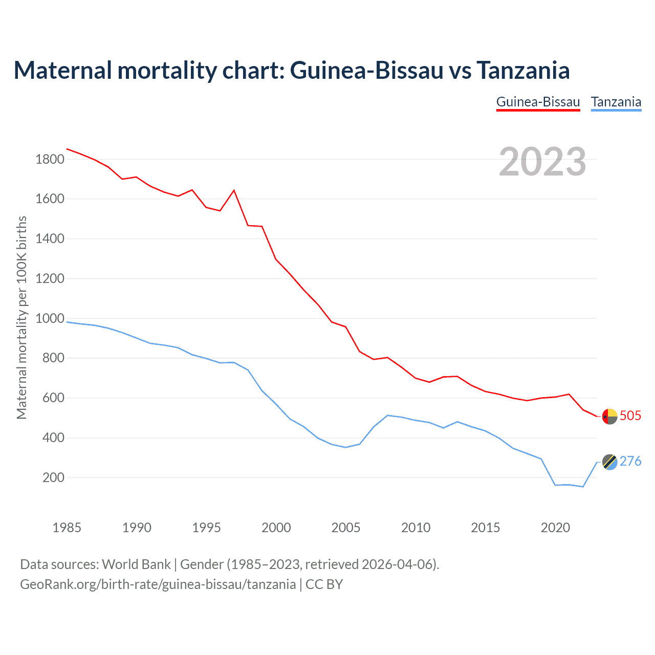 The maternal mortality rate, which is the probability of dying during childbirth or within 42 days of pregnancy termination, is 505 deaths per 100,000 live births in Guinea-Bissau, compared to 276 deaths in Tanzania.