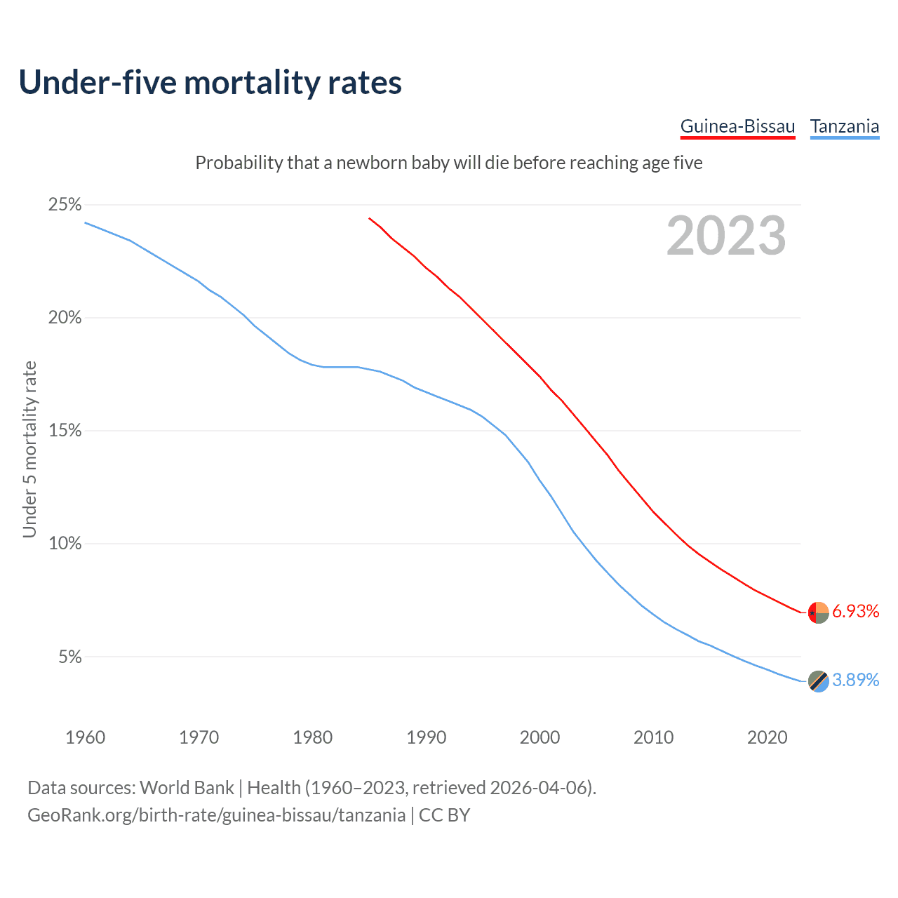 The chance that a newborn baby will die before reaching age five is 6.93% in Guinea-Bissau and 3.89% in Tanzania. Above is a chart with historical data on under-five mortality rates.