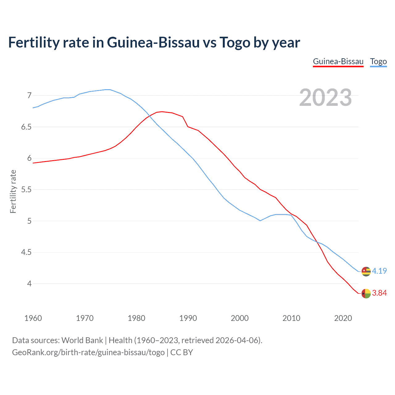 1960 vs 2023, the fertility rate has decreased by 35.2% in Guinea-Bissau and by 38.3% in Togo — in 1960, it was 5.92 and 6.8, respectively.
