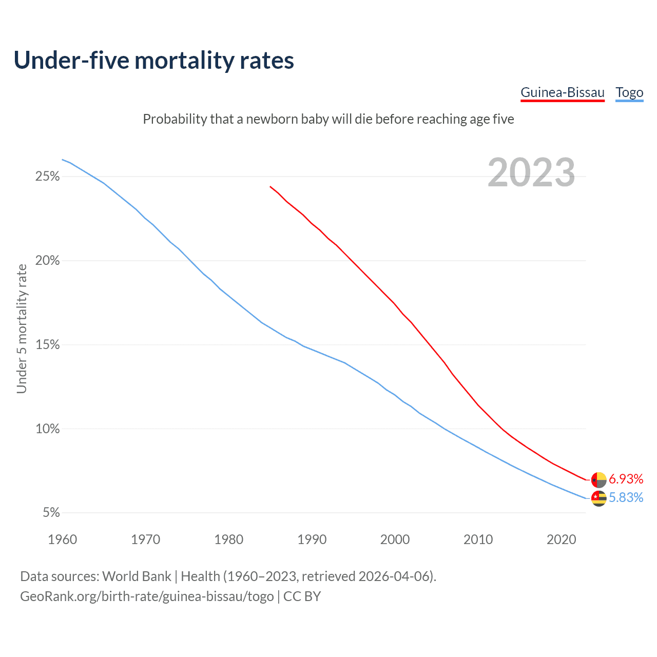 The chance that a newborn baby will die before reaching age five is 6.93% in Guinea-Bissau and 5.83% in Togo. Above is a chart with historical data on under-five mortality rates.