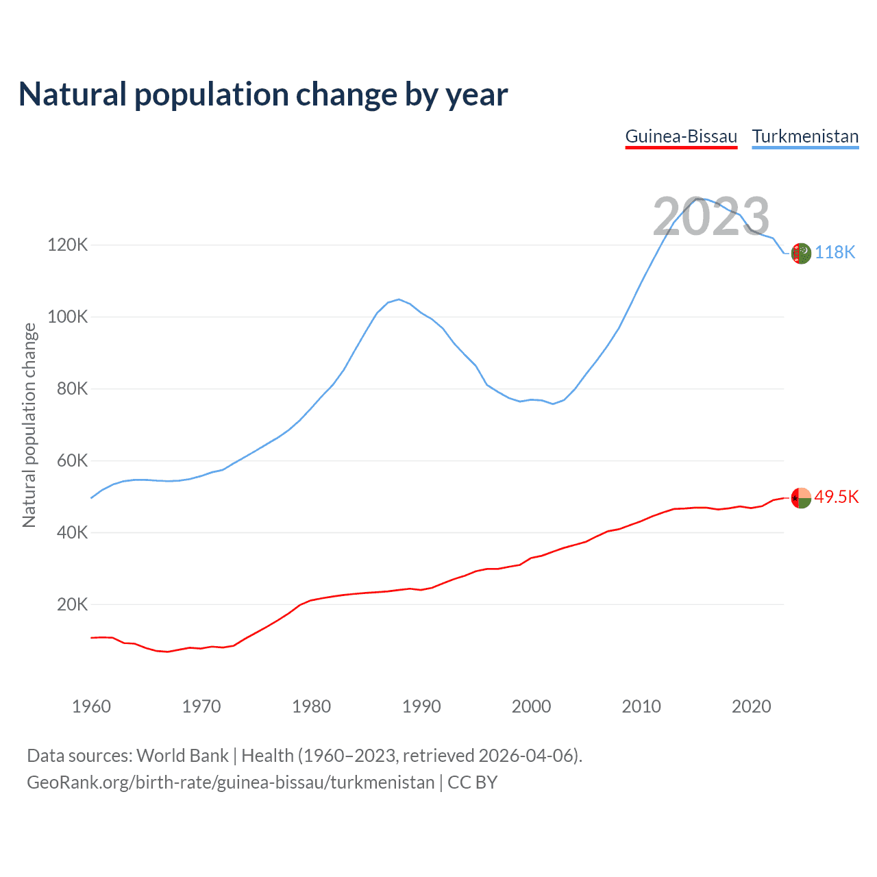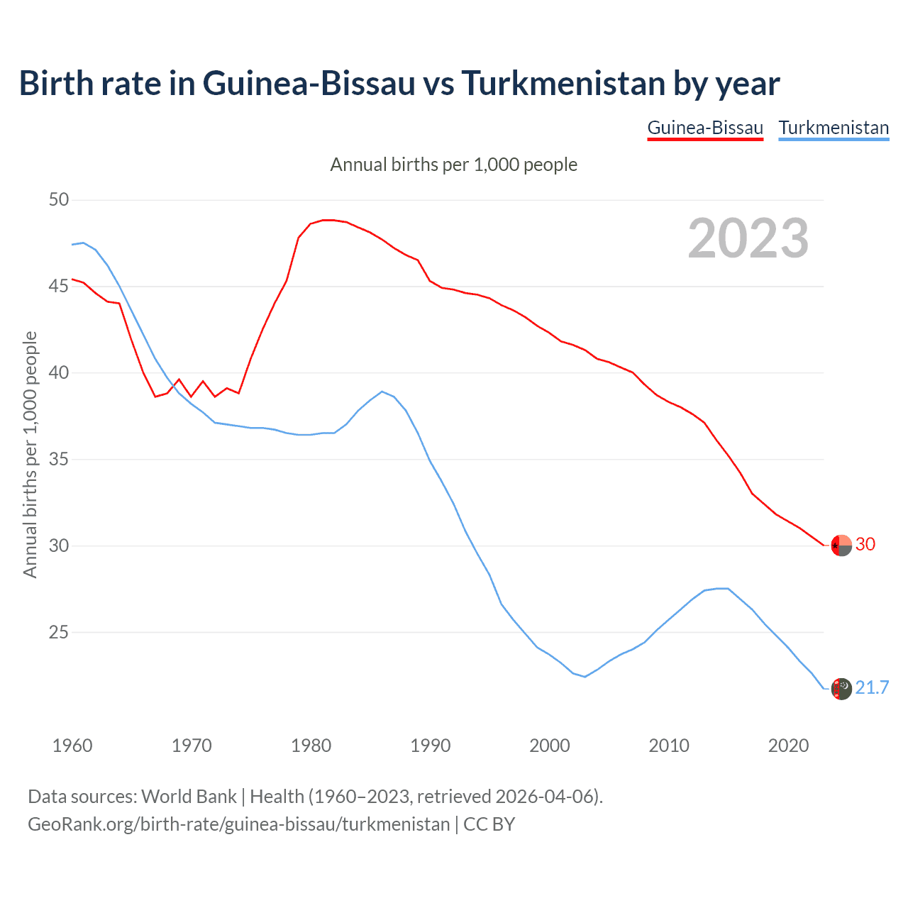According to the latest available data on birth rates, the fertility rate in Guinea-Bissau was 3.84 children per woman in 2023, compared to 2.69 in Turkmenistan in 2023. The replacement level is considered to be 2.1 children per woman.