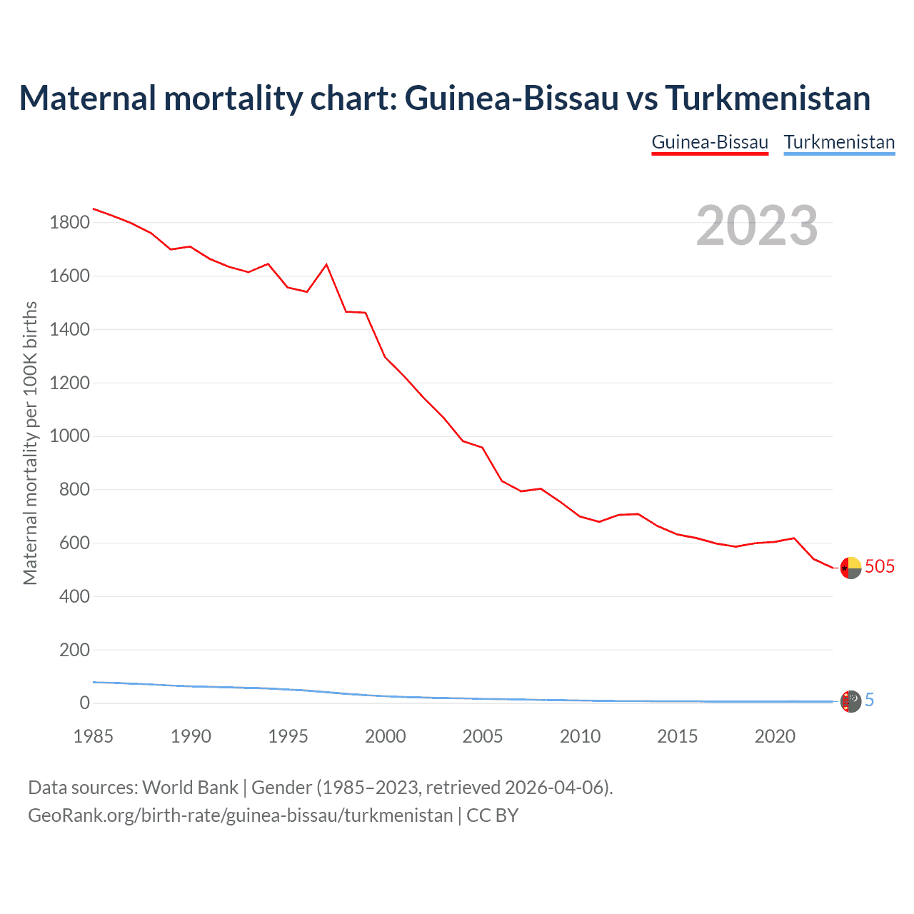 The maternal mortality rate, which is the probability of dying during childbirth or within 42 days of pregnancy termination, is 505 deaths per 100,000 live births in Guinea-Bissau, compared to 5 deaths in Turkmenistan.