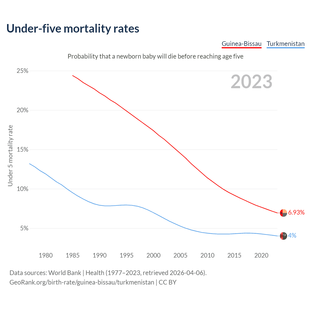 The chance that a newborn baby will die before reaching age five is 6.93% in Guinea-Bissau and 4% in Turkmenistan. Above is a chart with historical data on under-five mortality rates.