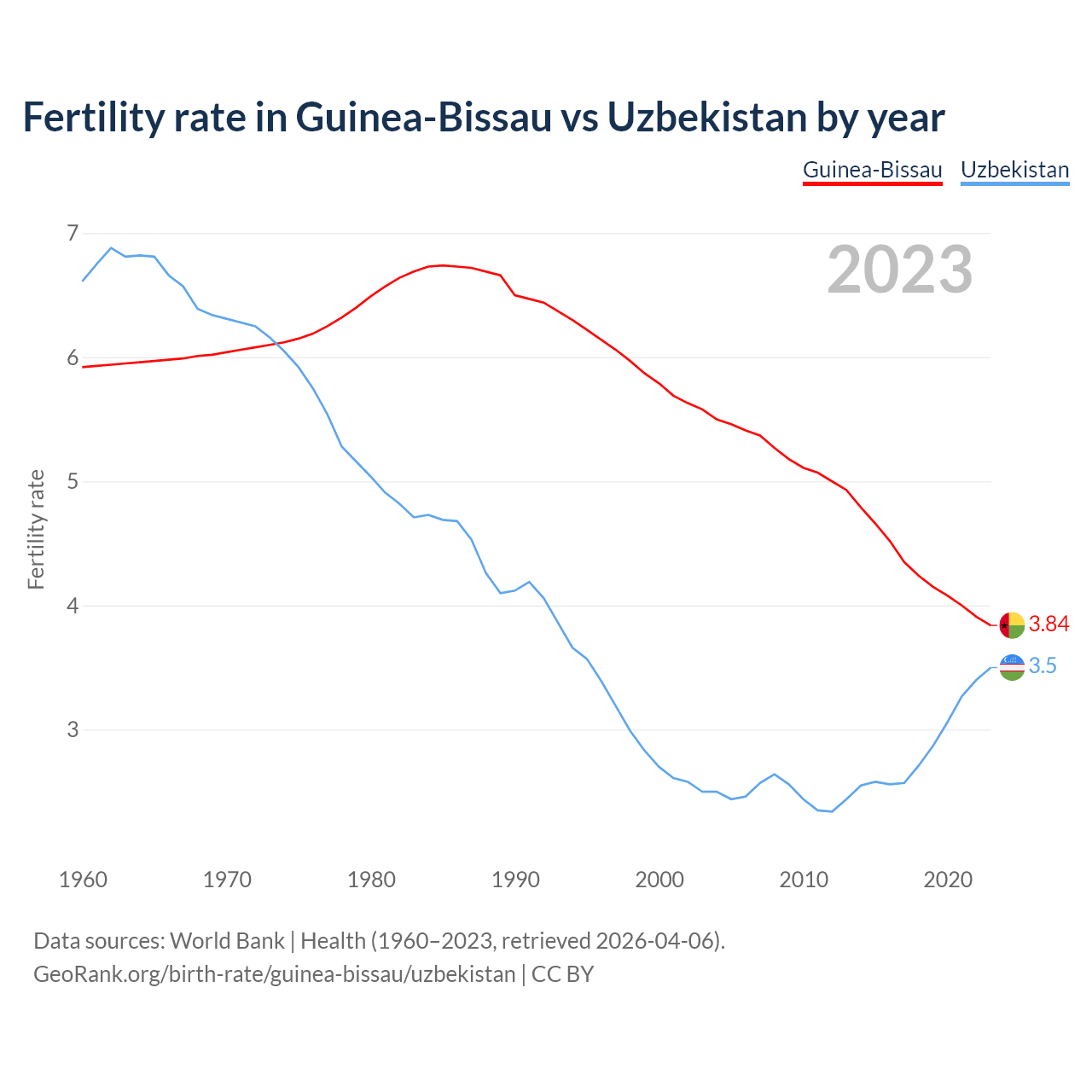 Fertility rate in Guinea-Bissau vs Uzbekistan by year