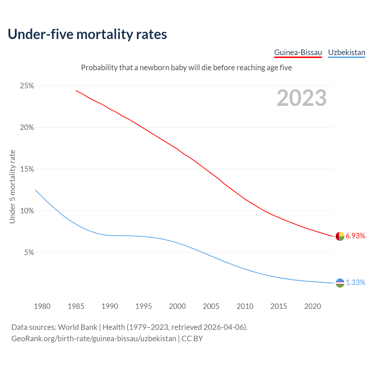 The chance that a newborn baby will die before reaching age five is 6.93% in Guinea-Bissau and 1.33% in Uzbekistan. Above is a chart with historical data on under-five mortality rates.