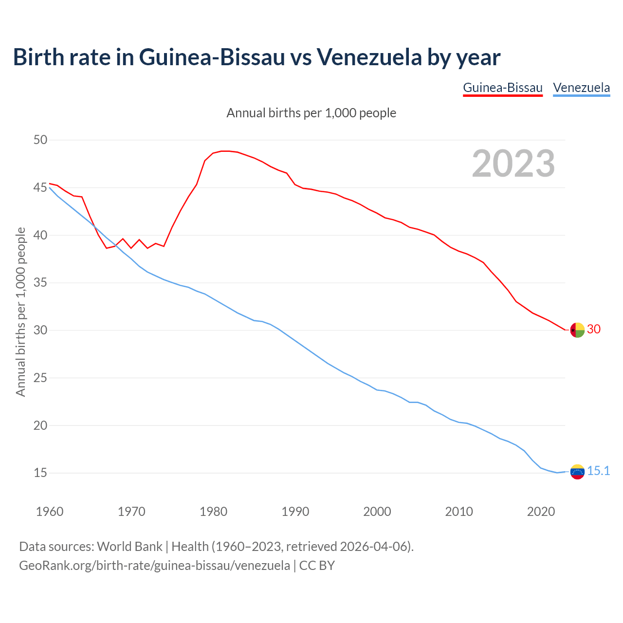 Guinea-Bissau has an annual birth rate of 30 births per 1,000 people, compared to 15.1 for Venezuela. The average number of children a woman is expected to have during her lifetime — the fertility rate, is 3.84 in Guinea-Bissau and 2.08 in Venezuela — 45.8% difference.