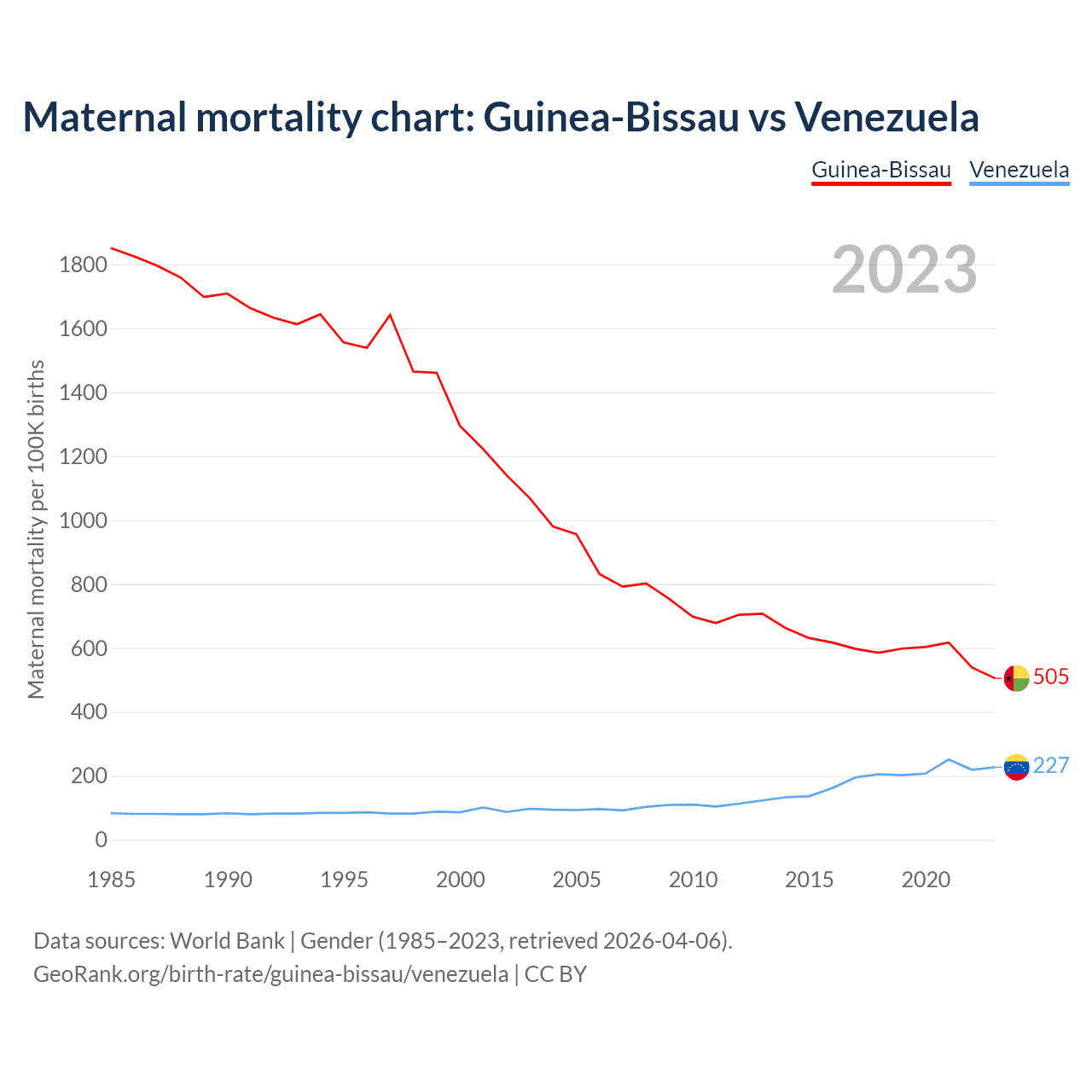 The maternal mortality rate, which is the probability of dying during childbirth or within 42 days of pregnancy termination, is 505 deaths per 100,000 live births in Guinea-Bissau, compared to 227 deaths in Venezuela.