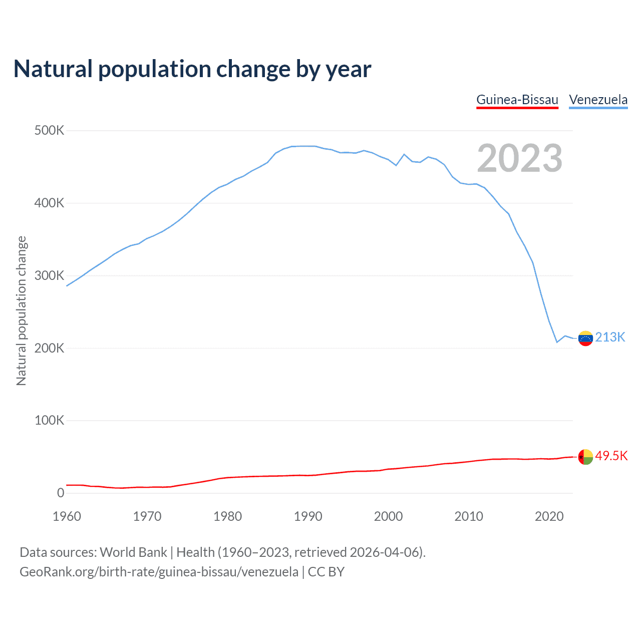 According to the latest available data on birth rates, the fertility rate in Guinea-Bissau was 3.84 children per woman in 2023, compared to 2.08 in Venezuela in 2023. The replacement level is considered to be 2.1 children per woman.