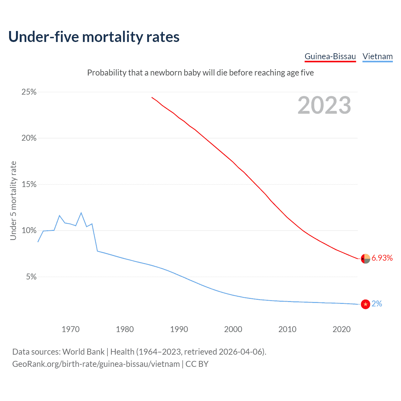 The chance that a newborn baby will die before reaching age five is 6.93% in Guinea-Bissau and 2% in Vietnam. Above is a chart with historical data on under-five mortality rates.