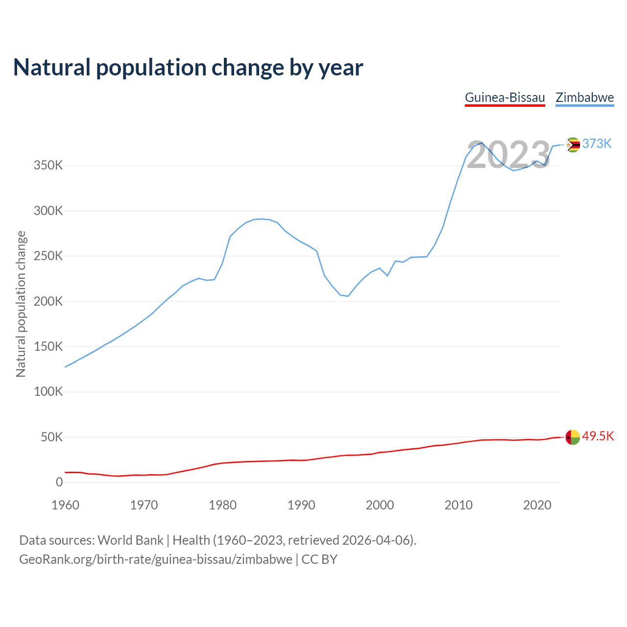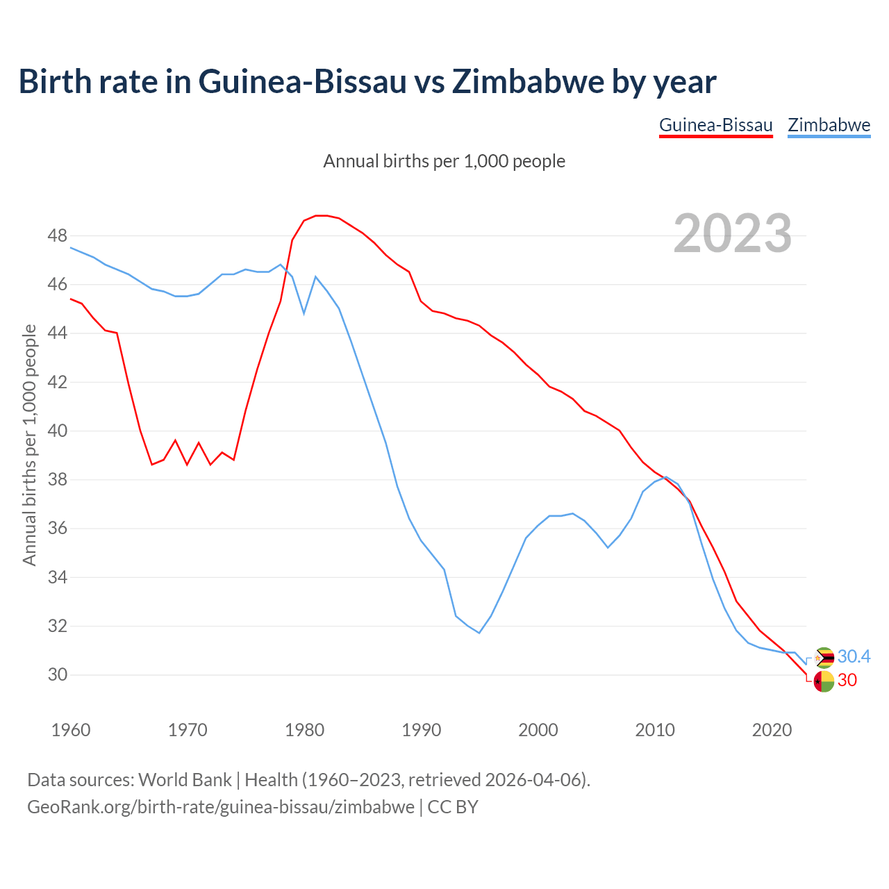Guinea-Bissau has an annual birth rate of 30 births per 1,000 people, compared to 30.4 for Zimbabwe. The average number of children a woman is expected to have during her lifetime — the fertility rate, is 3.84 in Guinea-Bissau and 3.72 in Zimbabwe — 2.92% difference.