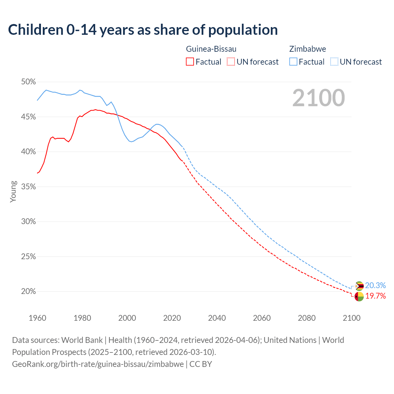 According to the latest available data on birth rates, the fertility rate in Guinea-Bissau was 3.84 children per woman in 2023, compared to 3.72 in Zimbabwe in 2023. The replacement level is considered to be 2.1 children per woman.