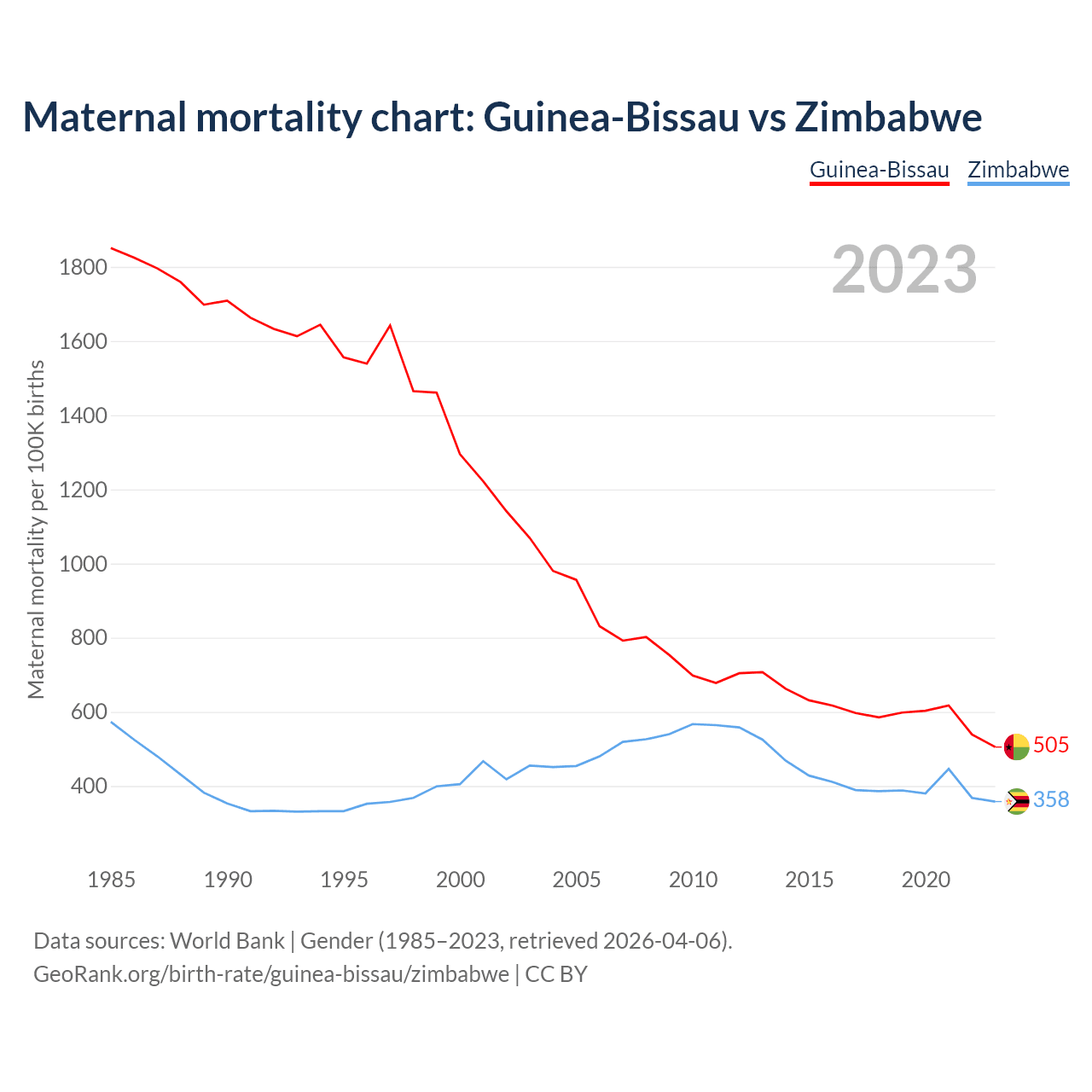 The maternal mortality rate, which is the probability of dying during childbirth or within 42 days of pregnancy termination, is 505 deaths per 100,000 live births in Guinea-Bissau, compared to 358 deaths in Zimbabwe.
