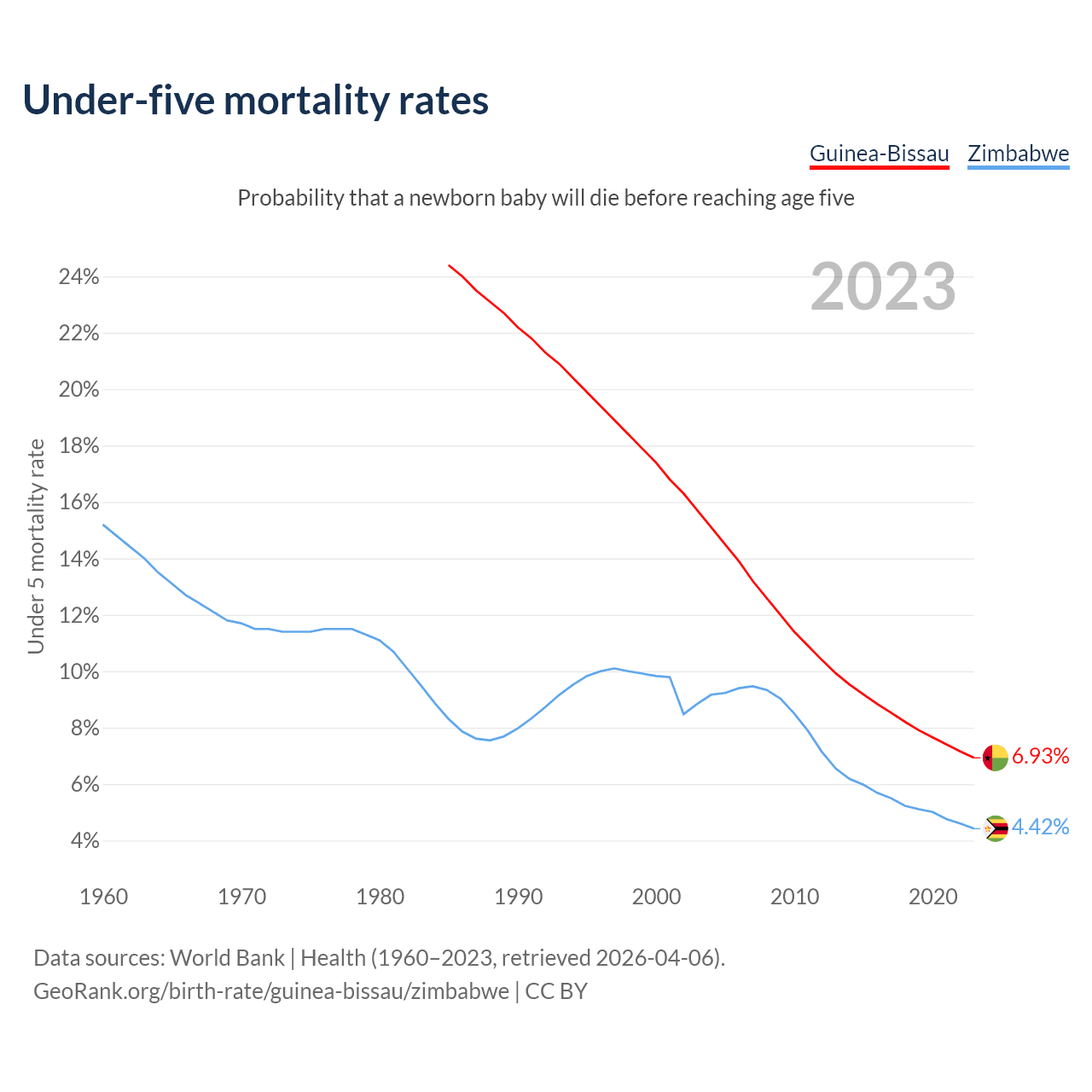 The chance that a newborn baby will die before reaching age five is 6.93% in Guinea-Bissau and 4.42% in Zimbabwe. Above is a chart with historical data on under-five mortality rates.