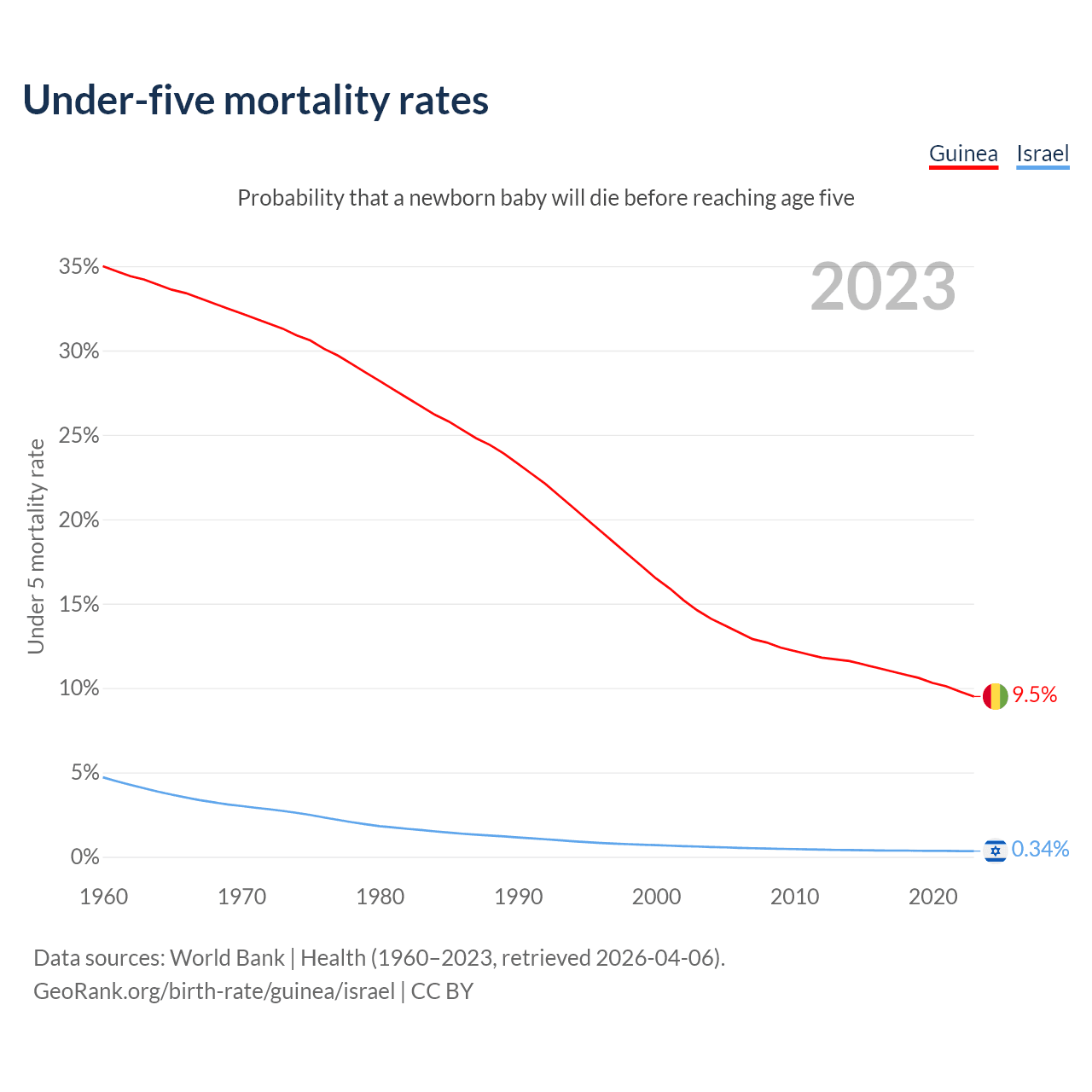 The chance that a newborn baby will die before reaching age five is 9.5% in Guinea and 0.34% in Israel. Above is a chart with historical data on under-five mortality rates.