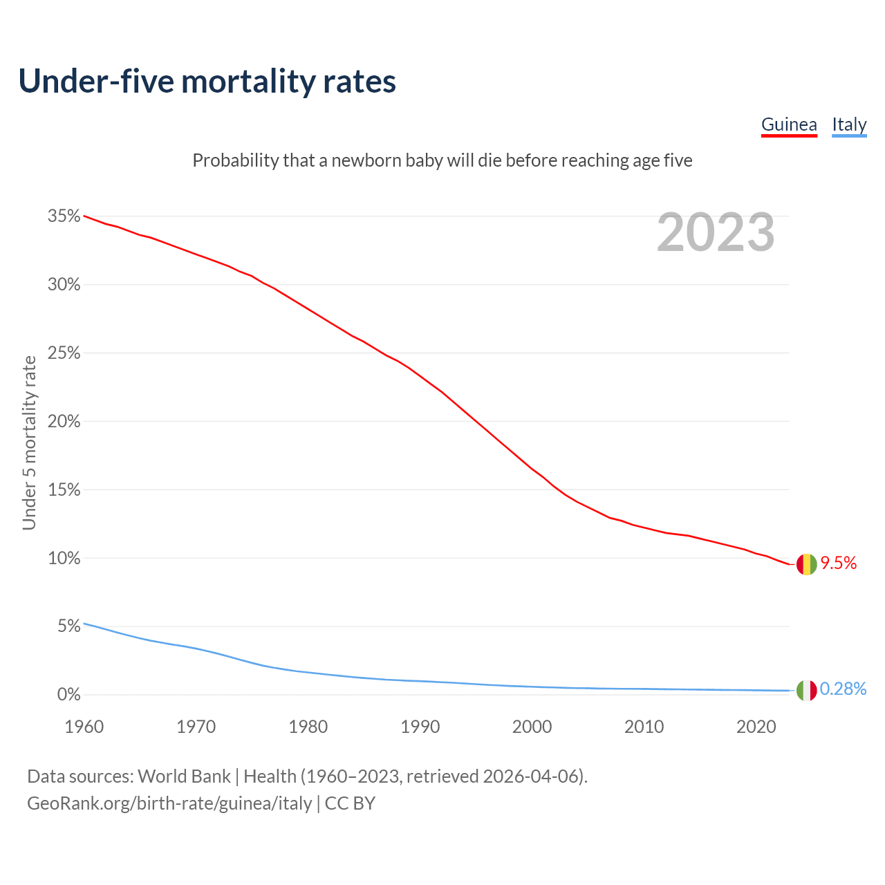 The chance that a newborn baby will die before reaching age five is 9.5% in Guinea and 0.28% in Italy. Above is a chart with historical data on under-five mortality rates.