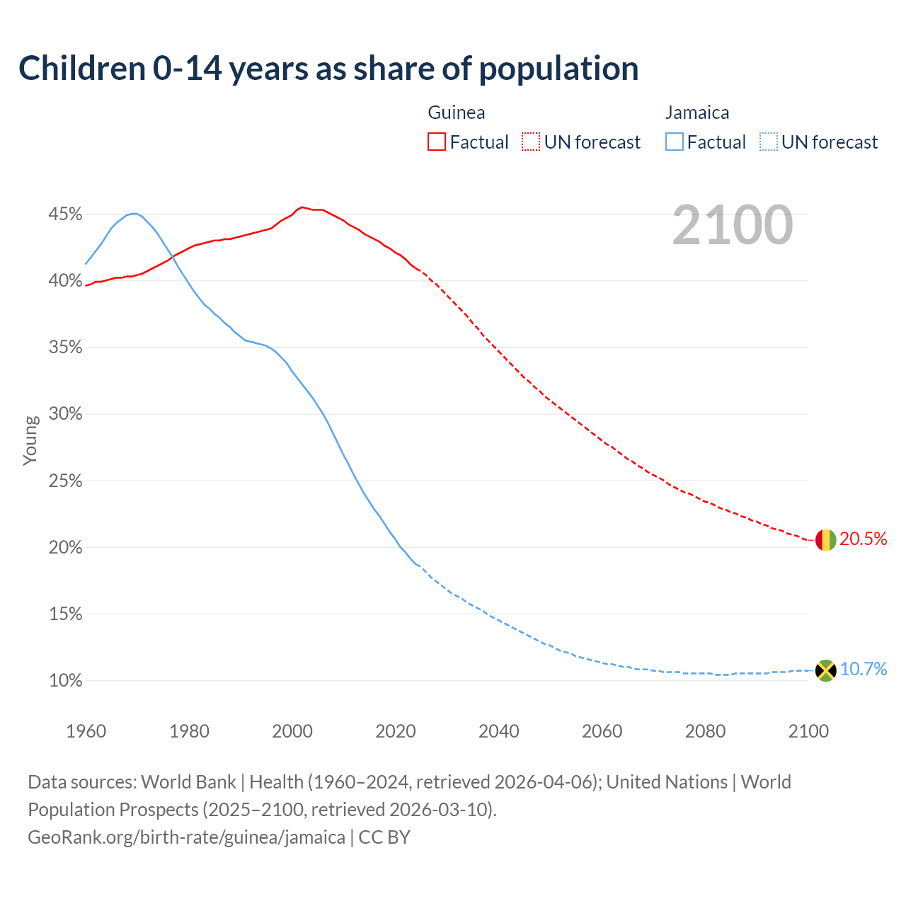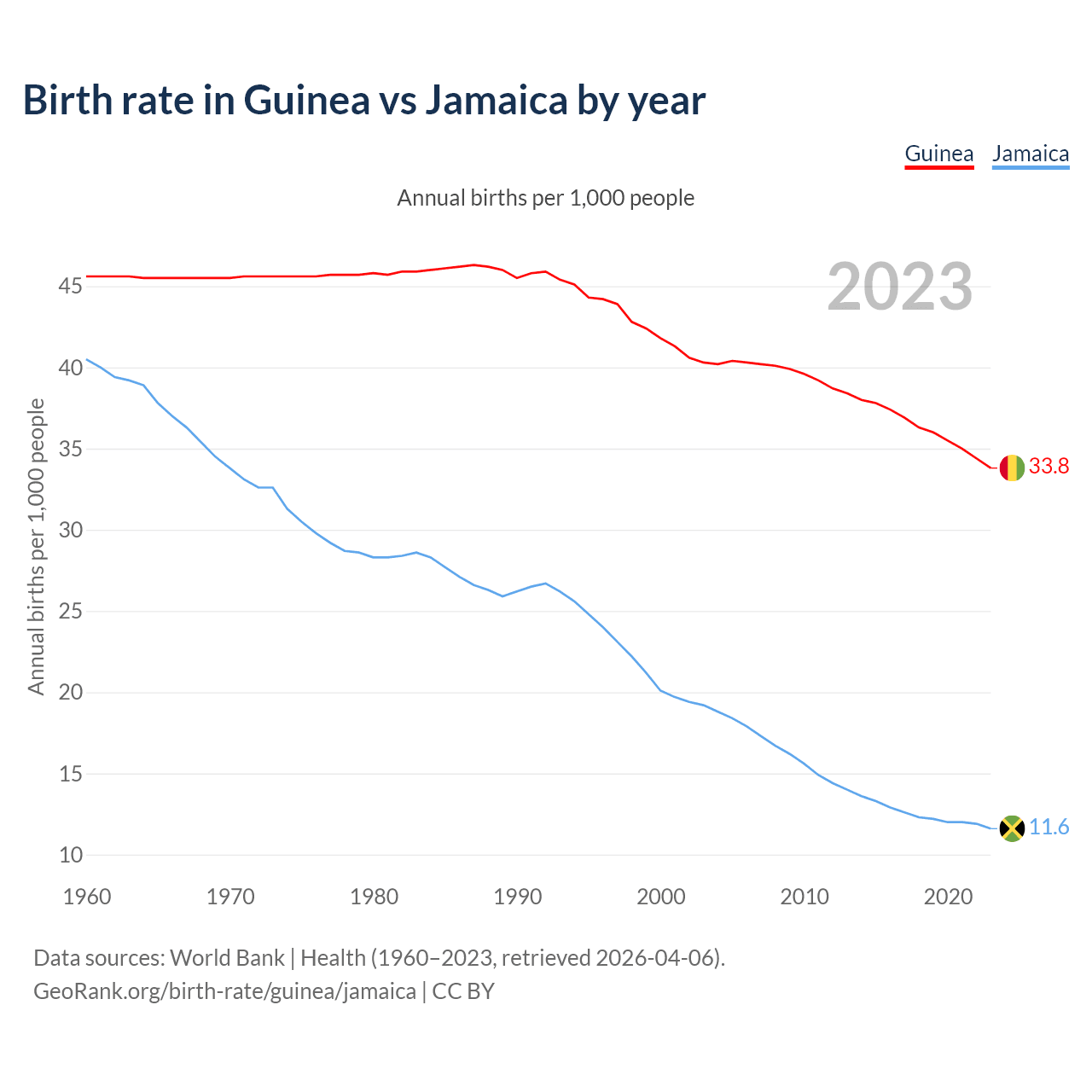 Guinea has an annual birth rate of 33.8 births per 1,000 people, compared to 11.6 for Jamaica. The average number of children a woman is expected to have during her lifetime — the fertility rate, is 4.22 in Guinea and 1.36 in Jamaica — 67.8% difference.