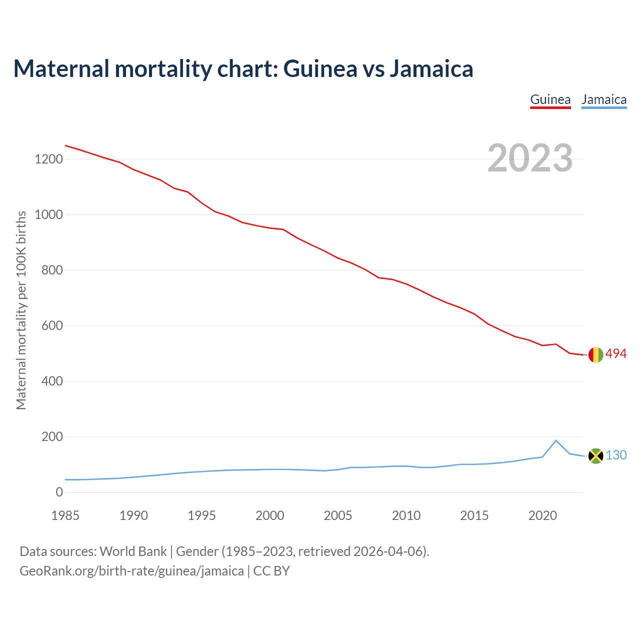 The maternal mortality rate, which is the probability of dying during childbirth or within 42 days of pregnancy termination, is 494 deaths per 100,000 live births in Guinea, compared to 130 deaths in Jamaica.