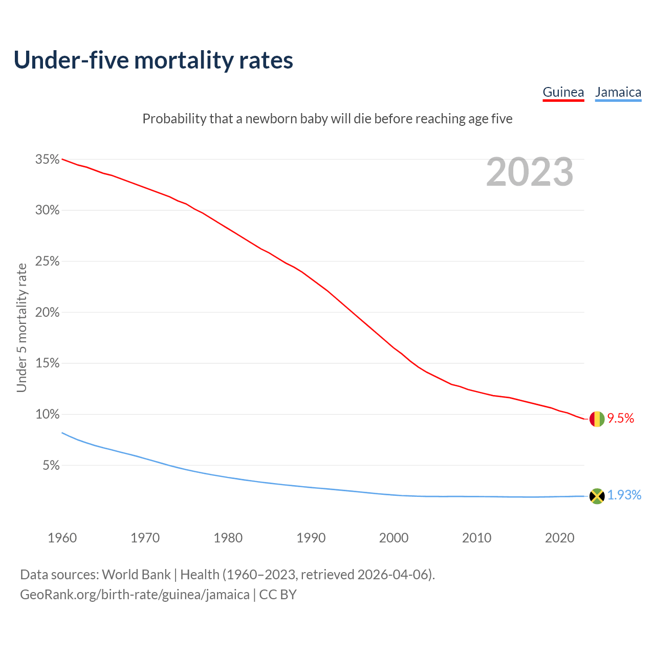 The chance that a newborn baby will die before reaching age five is 9.5% in Guinea and 1.93% in Jamaica. Above is a chart with historical data on under-five mortality rates.