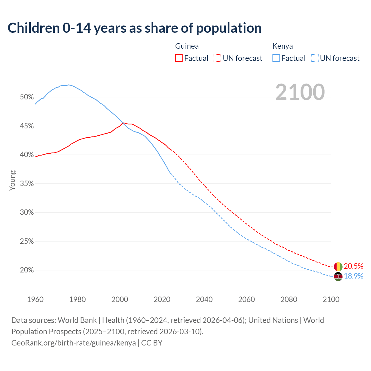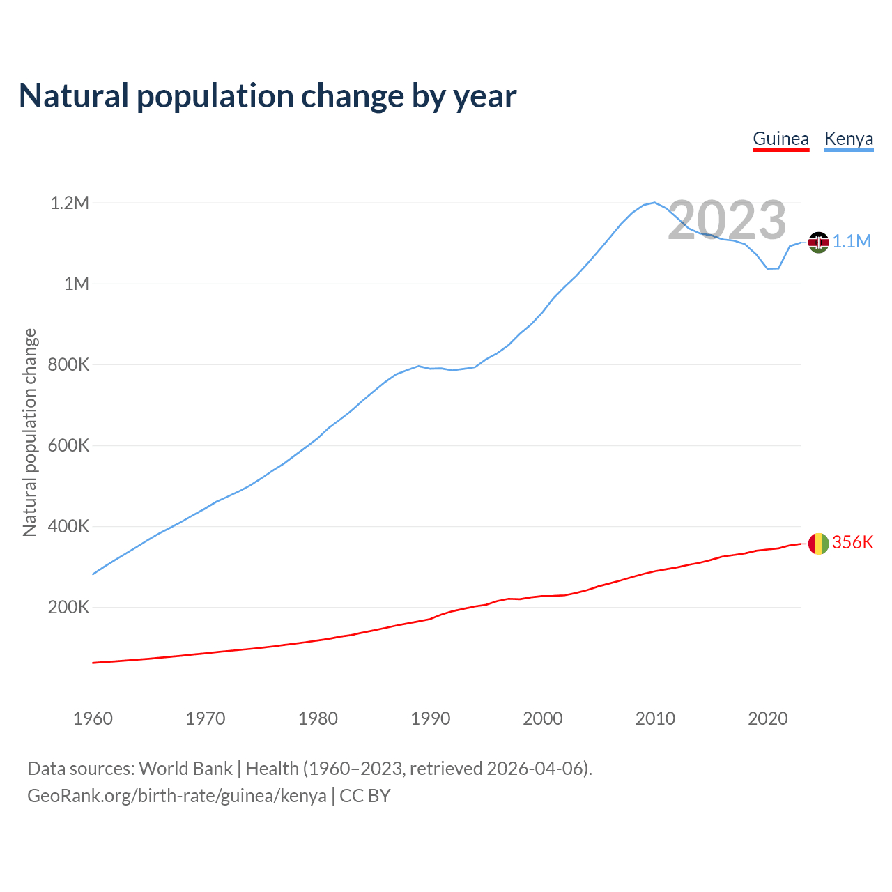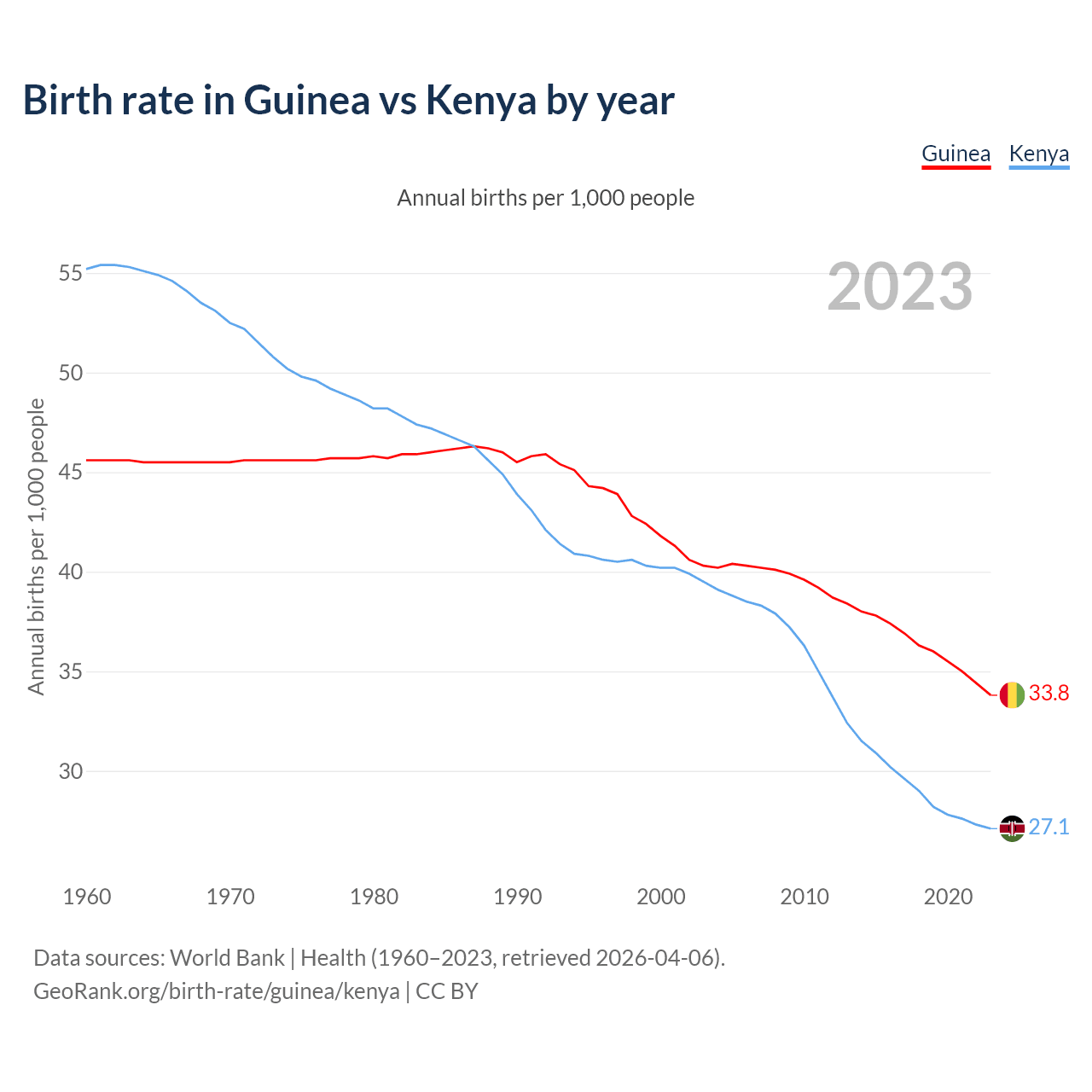 According to the latest available data on birth rates, the fertility rate in Guinea was 4.22 children per woman in 2023, compared to 3.21 in Kenya in 2023. The replacement level is considered to be 2.1 children per woman.