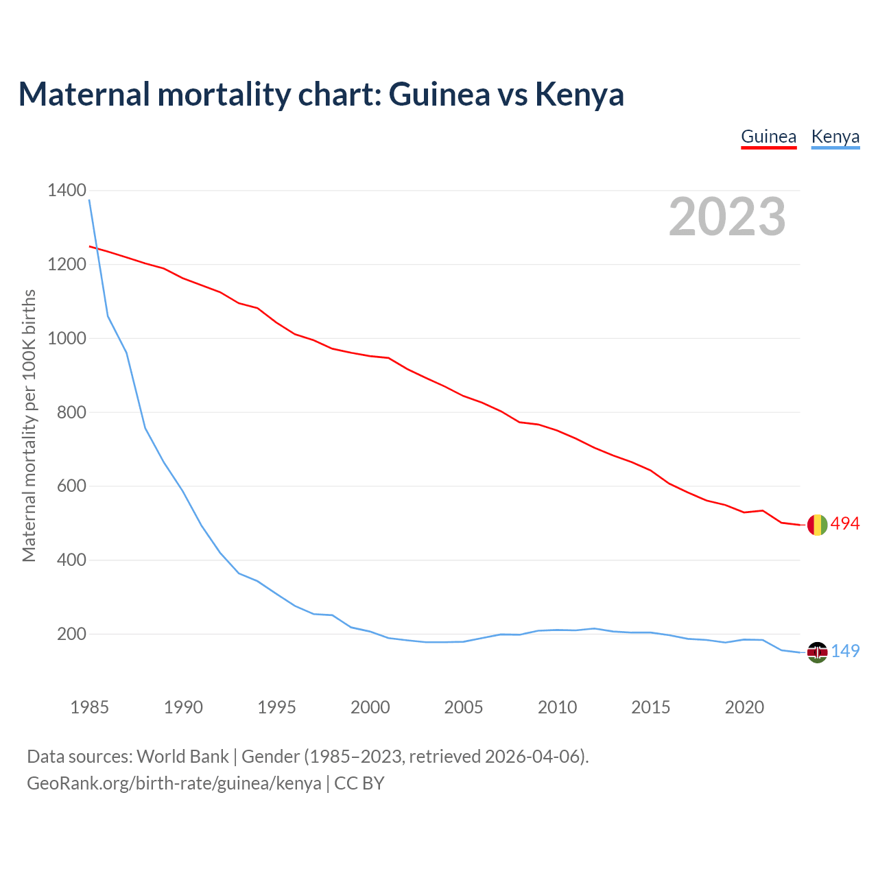 The maternal mortality rate, which is the probability of dying during childbirth or within 42 days of pregnancy termination, is 494 deaths per 100,000 live births in Guinea, compared to 149 deaths in Kenya.