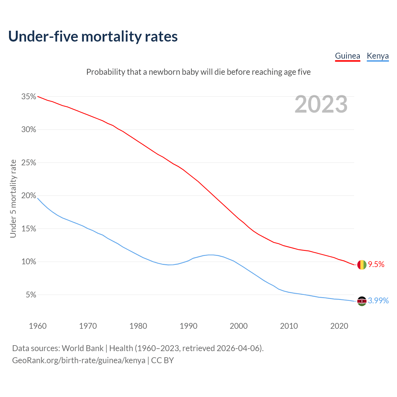 The chance that a newborn baby will die before reaching age five is 9.5% in Guinea and 3.99% in Kenya. Above is a chart with historical data on under-five mortality rates.