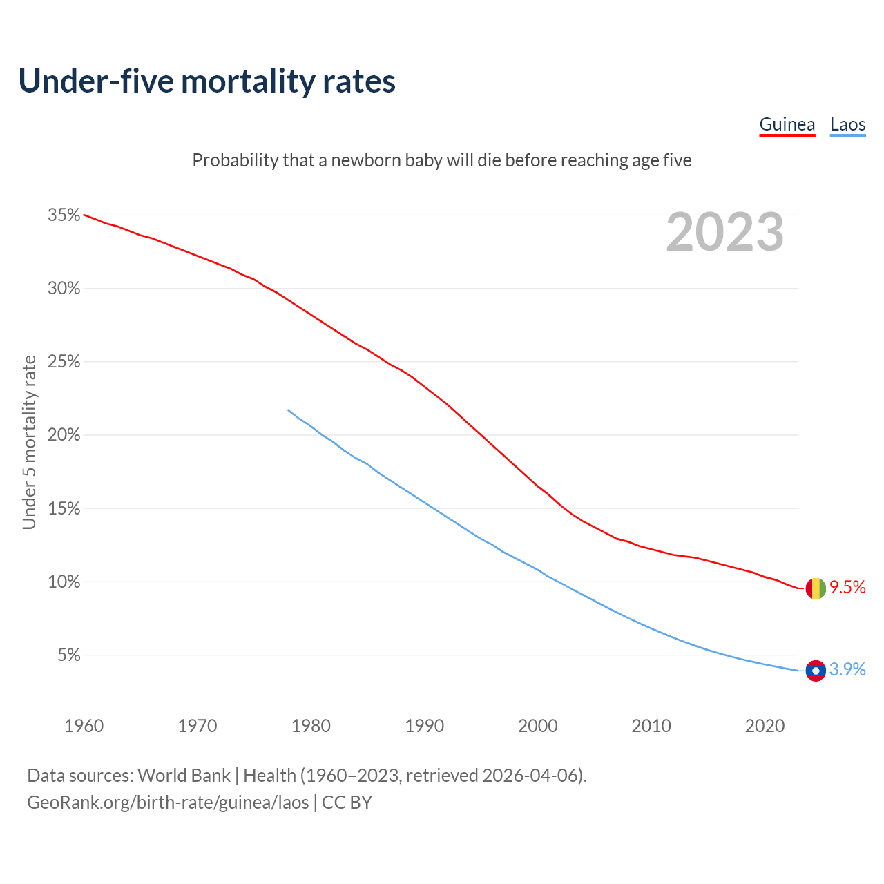 The chance that a newborn baby will die before reaching age five is 9.5% in Guinea and 3.9% in Laos. Above is a chart with historical data on under-five mortality rates.