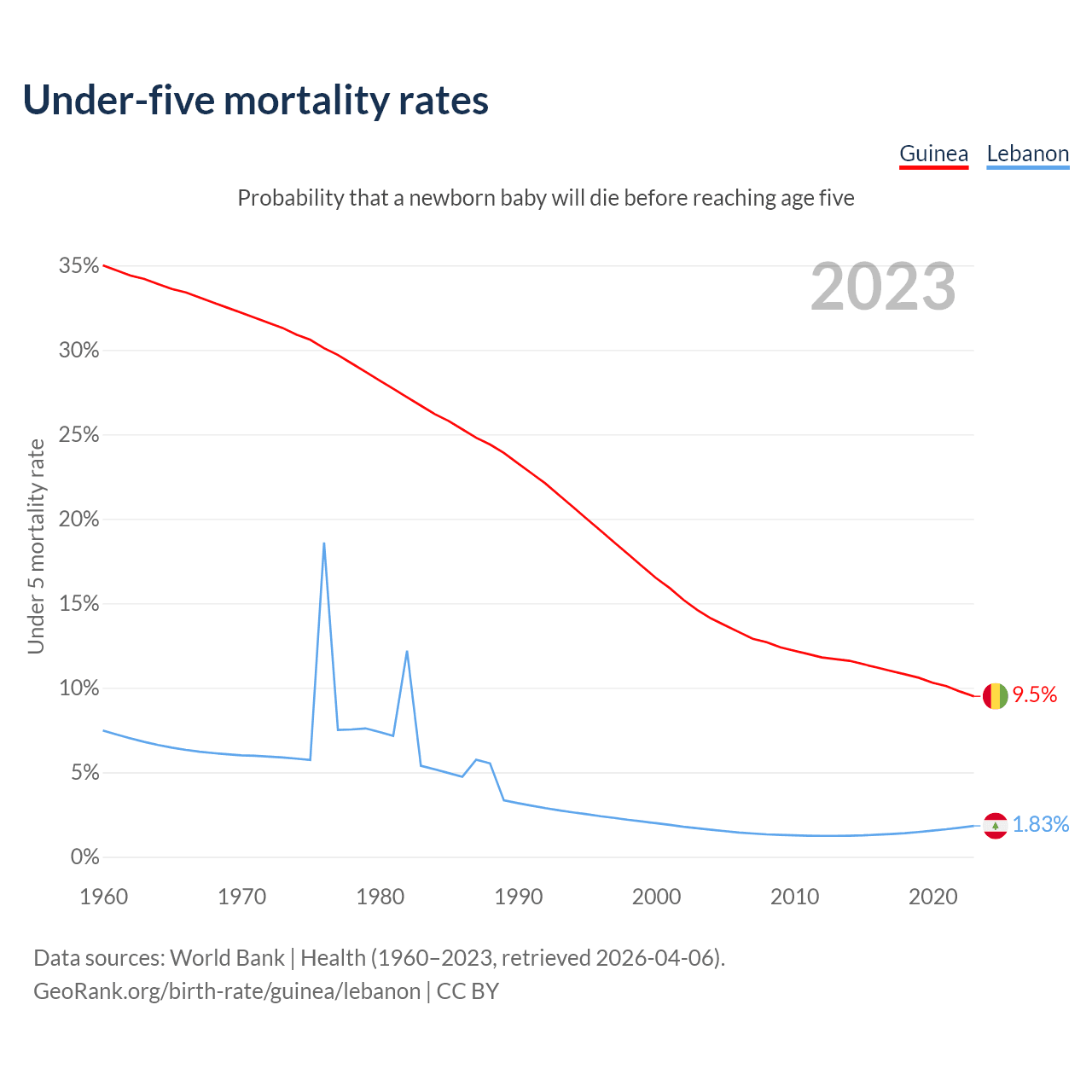 The chance that a newborn baby will die before reaching age five is 9.5% in Guinea and 1.83% in Lebanon. Above is a chart with historical data on under-five mortality rates.