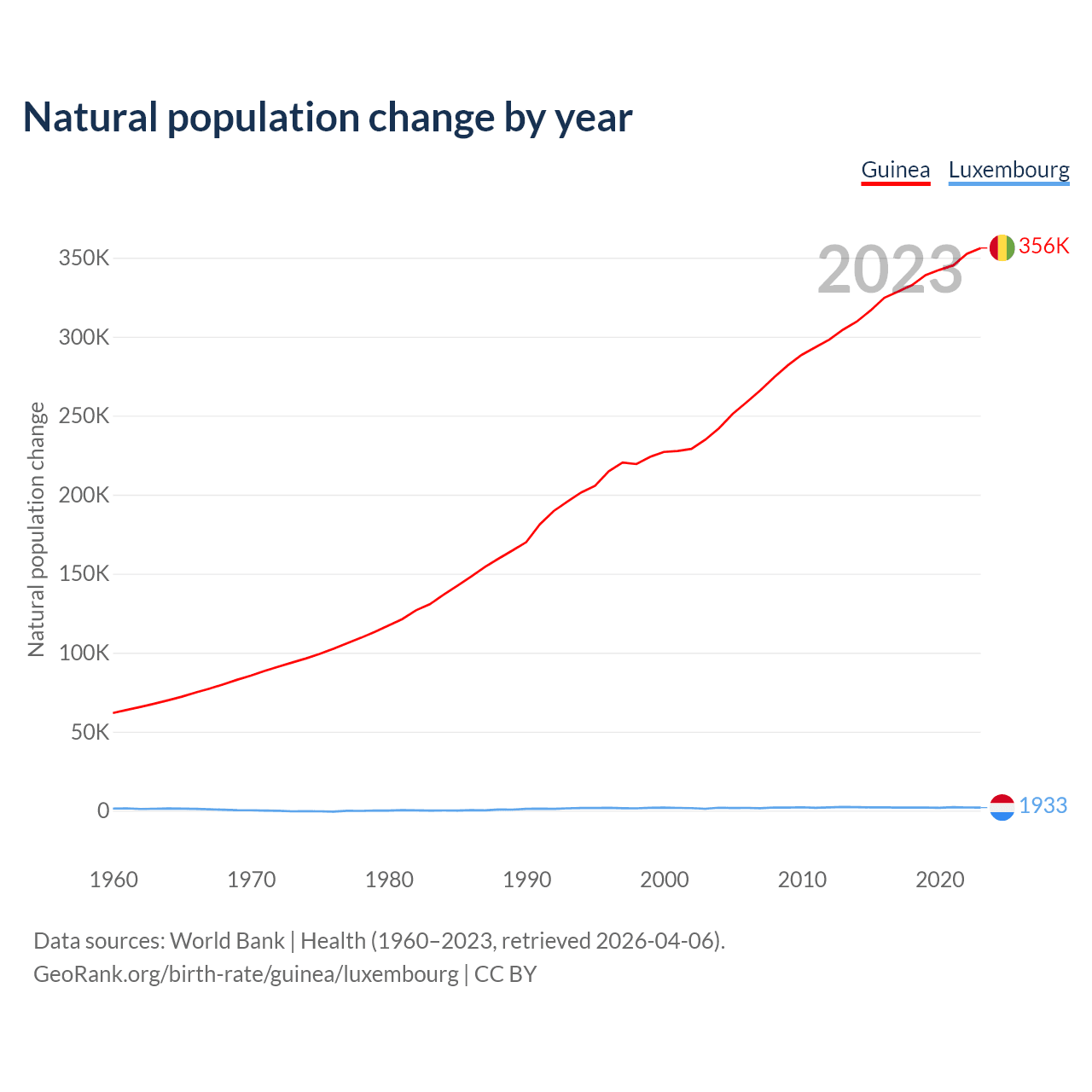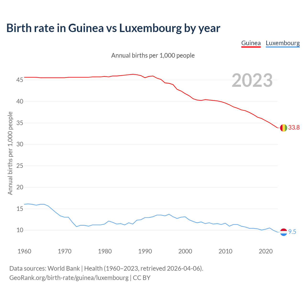 Guinea has an annual birth rate of 33.8 births per 1,000 people, compared to 9.5 for Luxembourg. The average number of children a woman is expected to have during her lifetime — the fertility rate, is 4.22 in Guinea and 1.25 in Luxembourg — 70.4% difference.