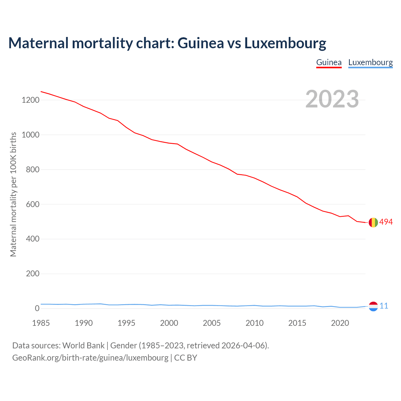 The maternal mortality rate, which is the probability of dying during childbirth or within 42 days of pregnancy termination, is 494 deaths per 100,000 live births in Guinea, compared to 11 deaths in Luxembourg.