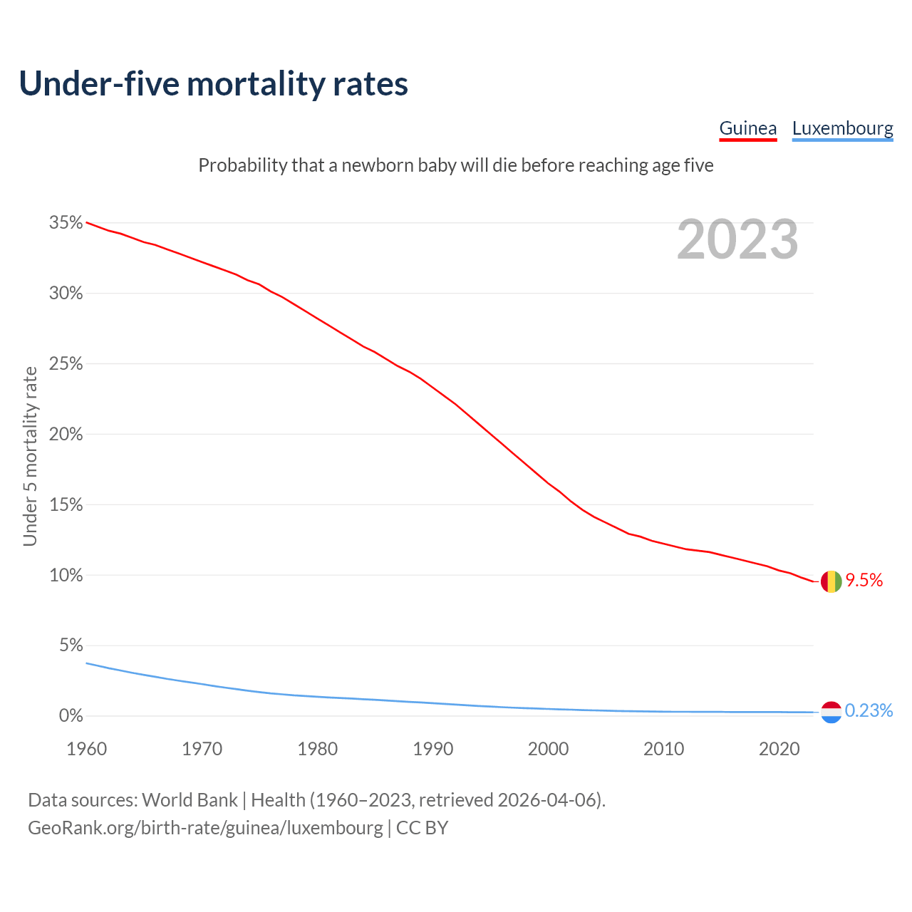 The chance that a newborn baby will die before reaching age five is 9.5% in Guinea and 0.23% in Luxembourg. Above is a chart with historical data on under-five mortality rates.