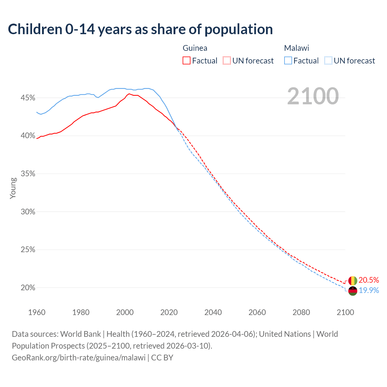 According to the latest available data on birth rates, the fertility rate in Guinea was 4.22 children per woman in 2023, compared to 3.65 in Malawi in 2023. The replacement level is considered to be 2.1 children per woman.