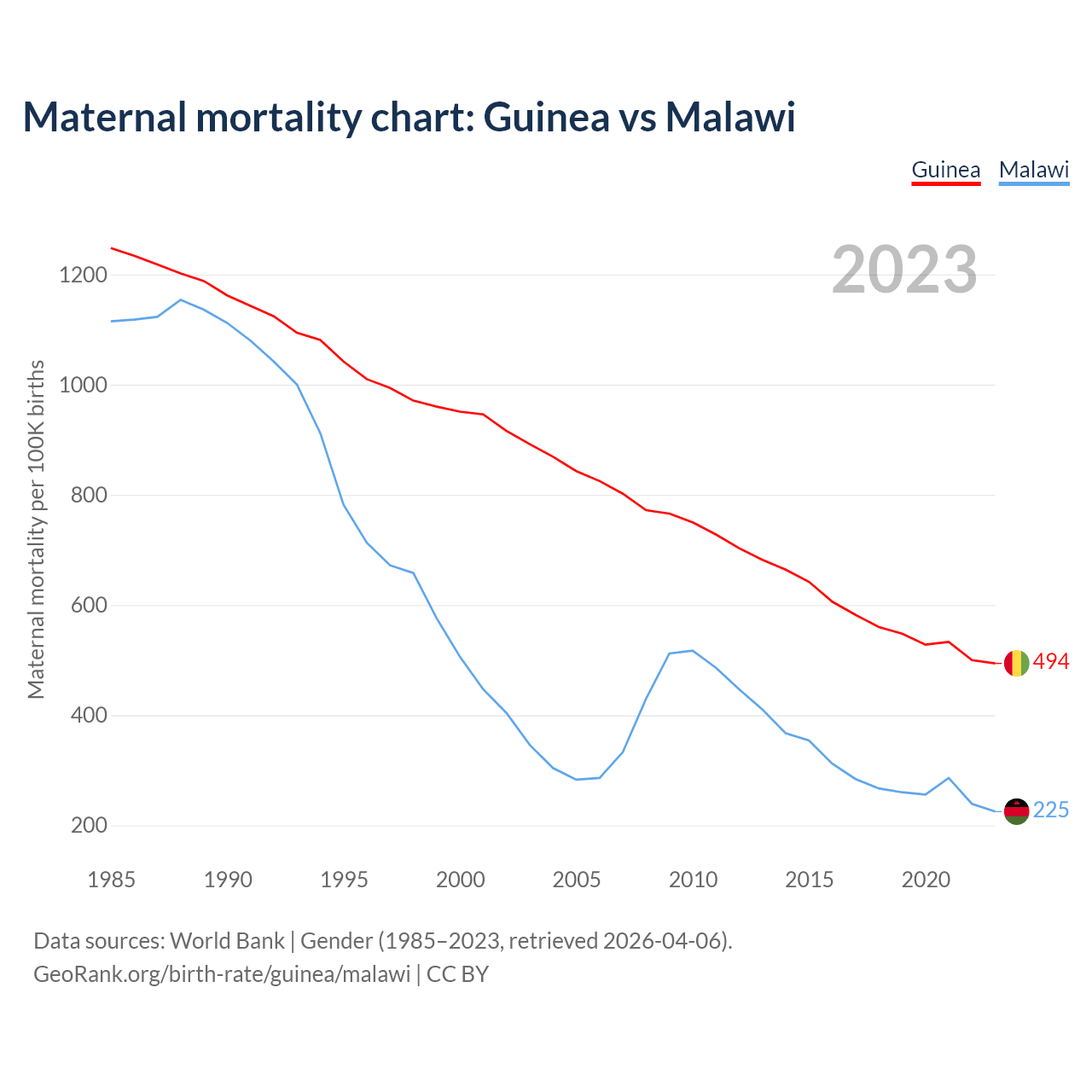 The maternal mortality rate, which is the probability of dying during childbirth or within 42 days of pregnancy termination, is 494 deaths per 100,000 live births in Guinea, compared to 225 deaths in Malawi.