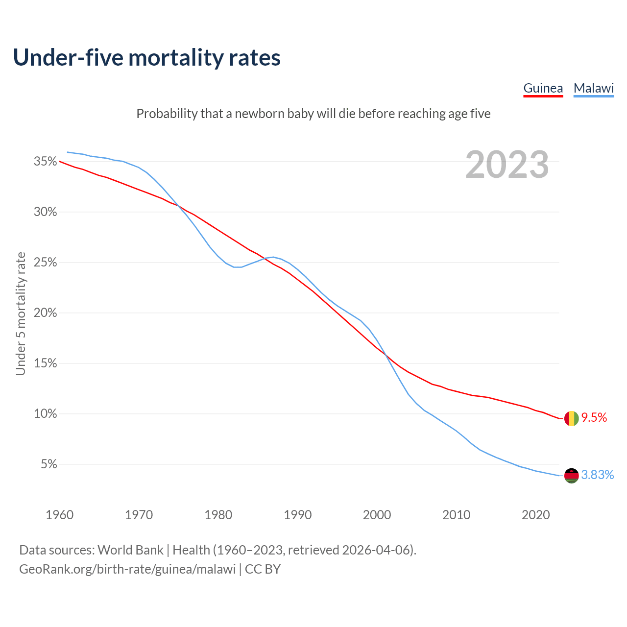 The chance that a newborn baby will die before reaching age five is 9.5% in Guinea and 3.83% in Malawi. Above is a chart with historical data on under-five mortality rates.
