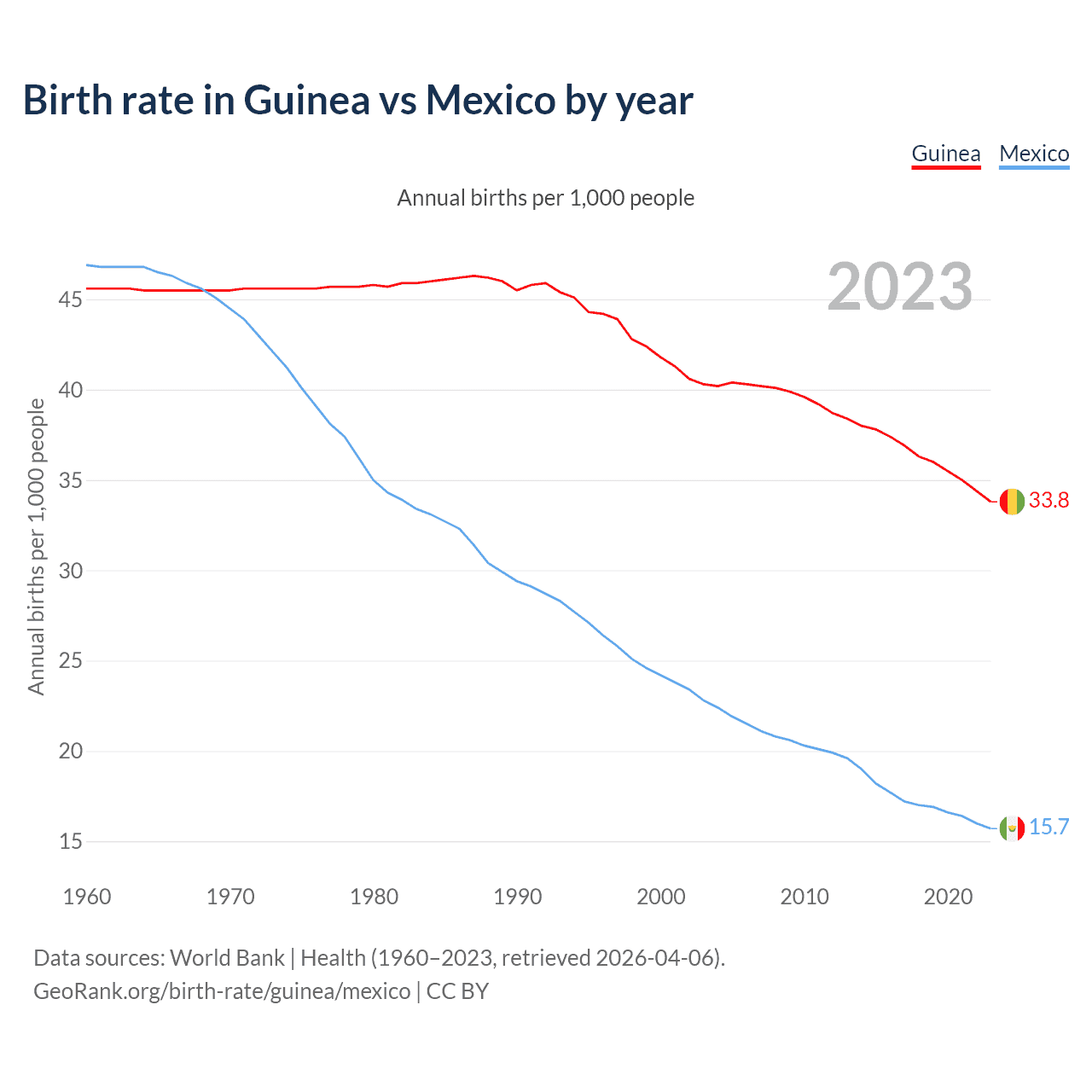 Guinea has an annual birth rate of 33.8 births per 1,000 people, compared to 15.7 for Mexico. The average number of children a woman is expected to have during her lifetime — the fertility rate, is 4.22 in Guinea and 1.91 in Mexico — 54.7% difference.