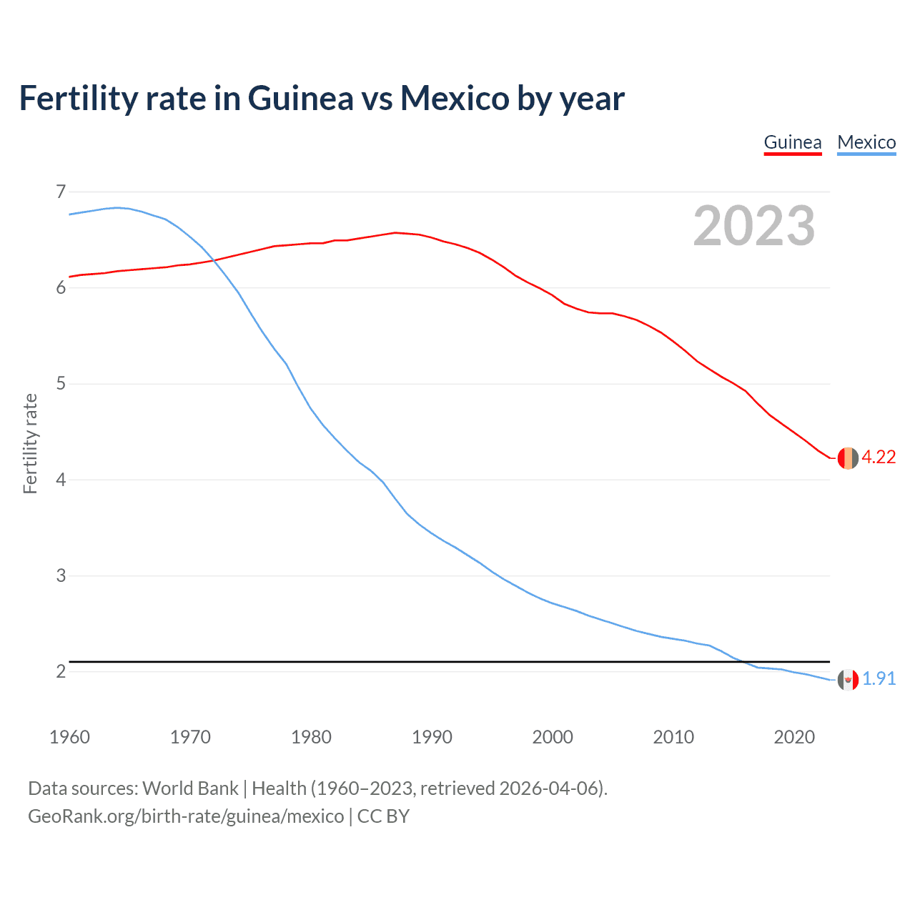 According to the latest available data on birth rates, the fertility rate in Guinea was 4.22 children per woman in 2023, compared to 1.91 in Mexico in 2023. The replacement level is considered to be 2.1 children per woman.