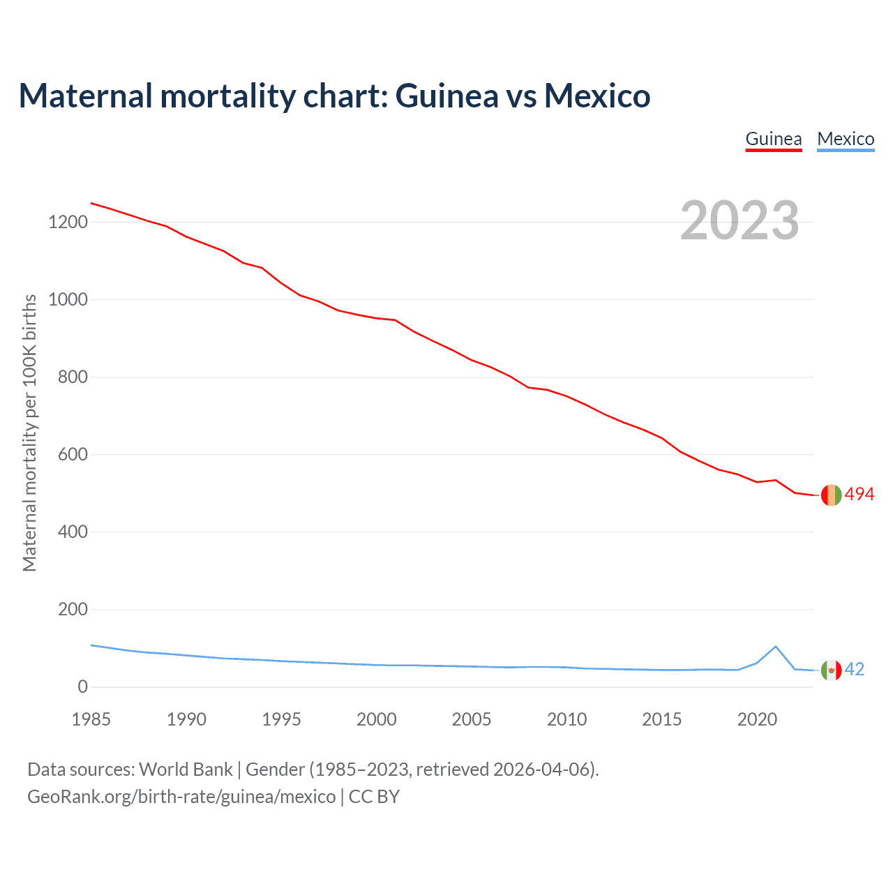 The maternal mortality rate, which is the probability of dying during childbirth or within 42 days of pregnancy termination, is 494 deaths per 100,000 live births in Guinea, compared to 42 deaths in Mexico.