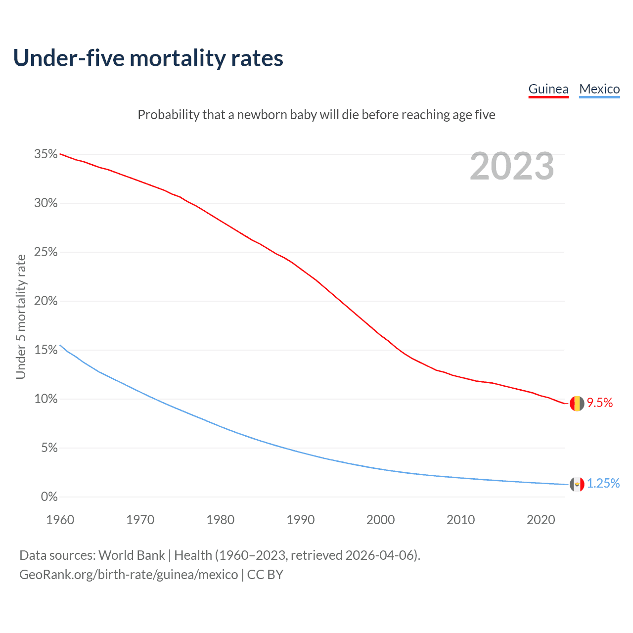 The chance that a newborn baby will die before reaching age five is 9.5% in Guinea and 1.25% in Mexico. Above is a chart with historical data on under-five mortality rates.
