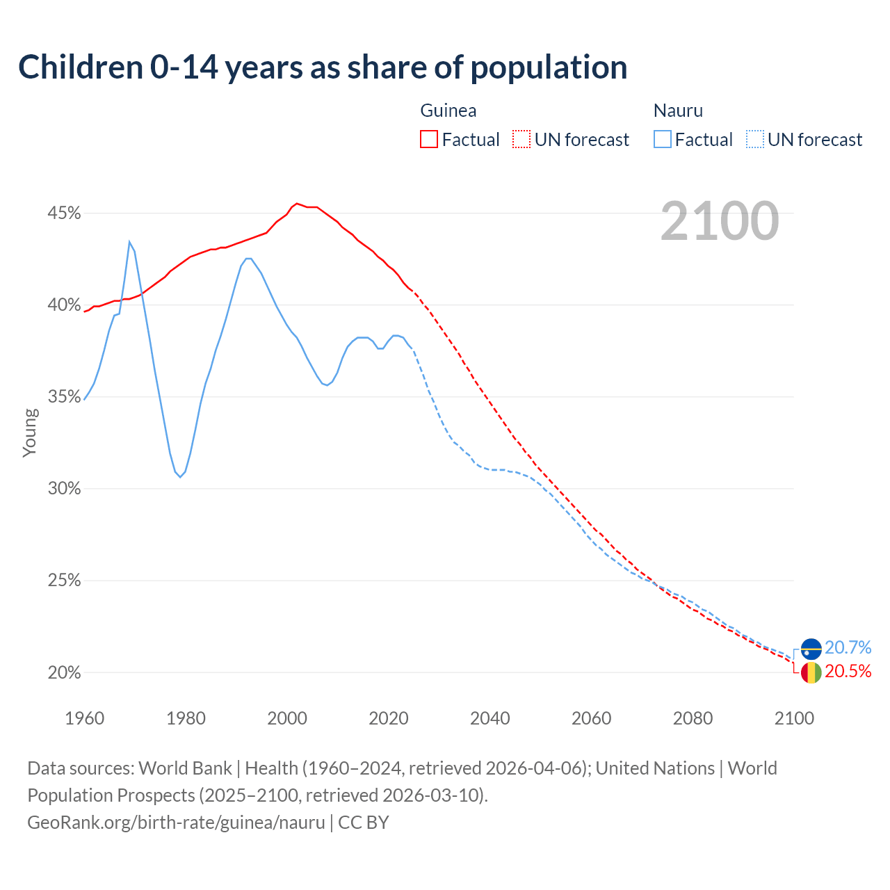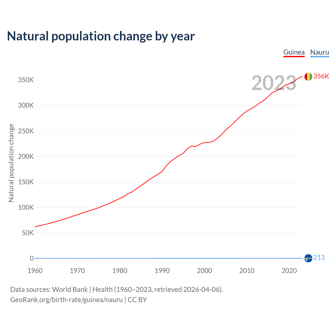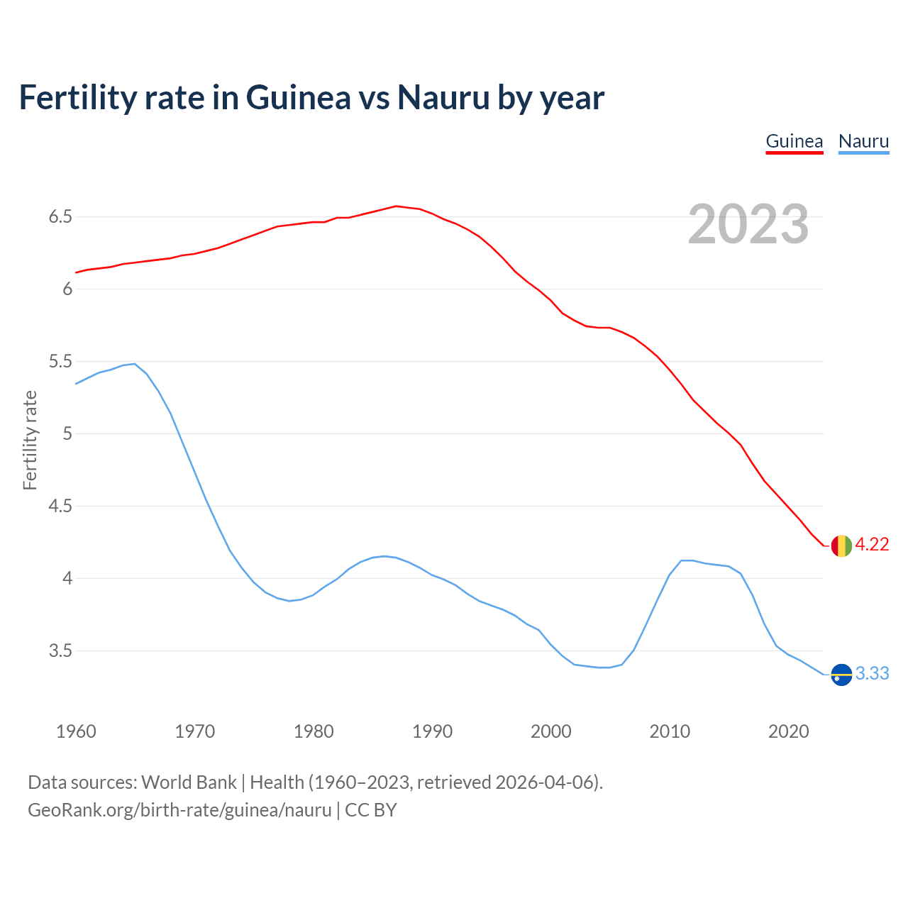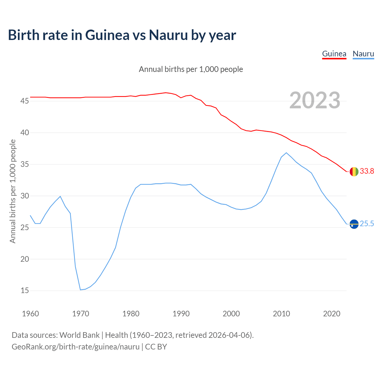 Guinea has an annual birth rate of 33.8 births per 1,000 people, compared to 25.5 for Nauru. The average number of children a woman is expected to have during her lifetime — the fertility rate, is 4.22 in Guinea and 3.33 in Nauru — 21% difference.