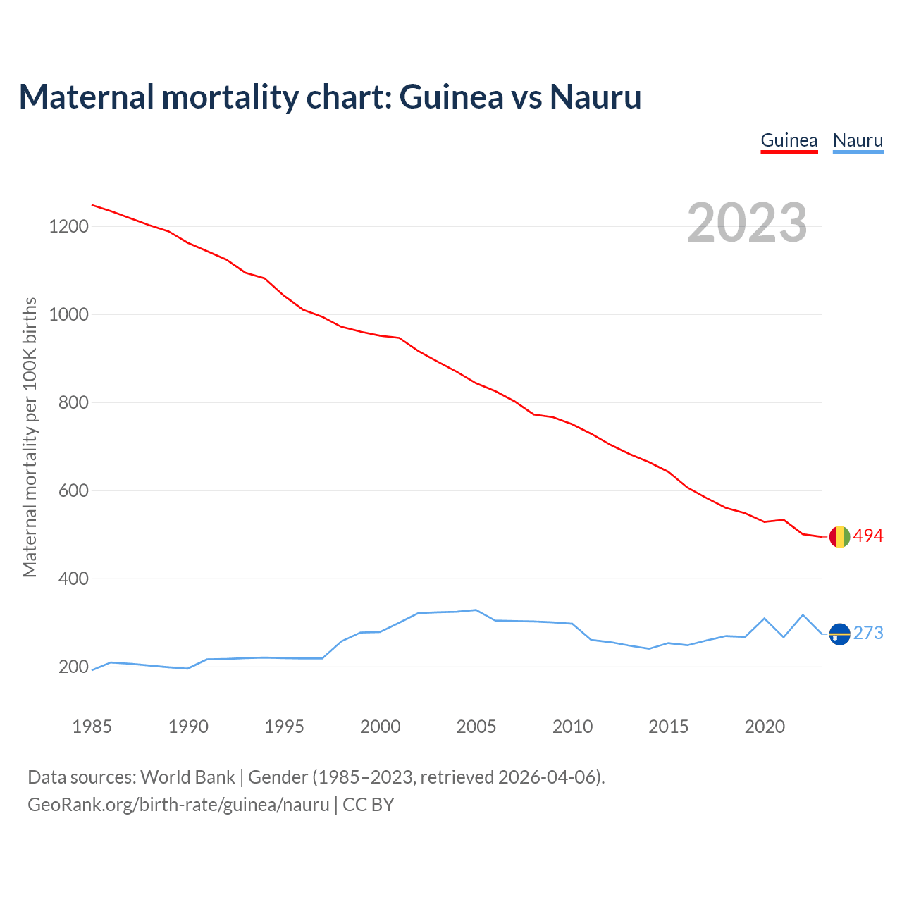 The maternal mortality rate, which is the probability of dying during childbirth or within 42 days of pregnancy termination, is 494 deaths per 100,000 live births in Guinea, compared to 273 deaths in Nauru.