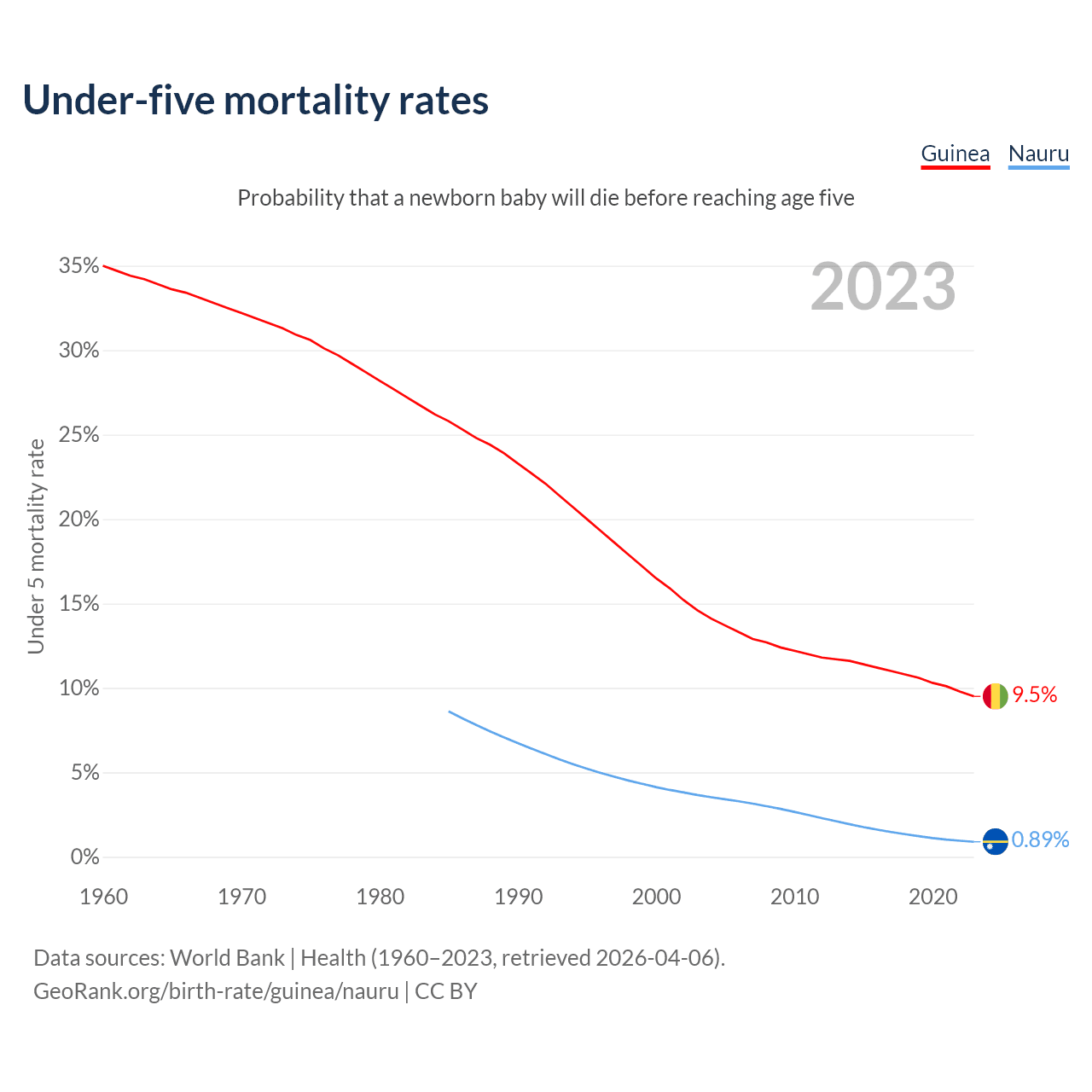 The chance that a newborn baby will die before reaching age five is 9.5% in Guinea and 0.89% in Nauru. Above is a chart with historical data on under-five mortality rates.
