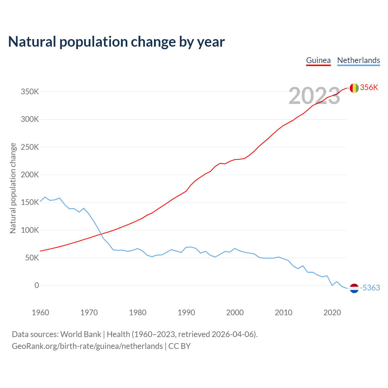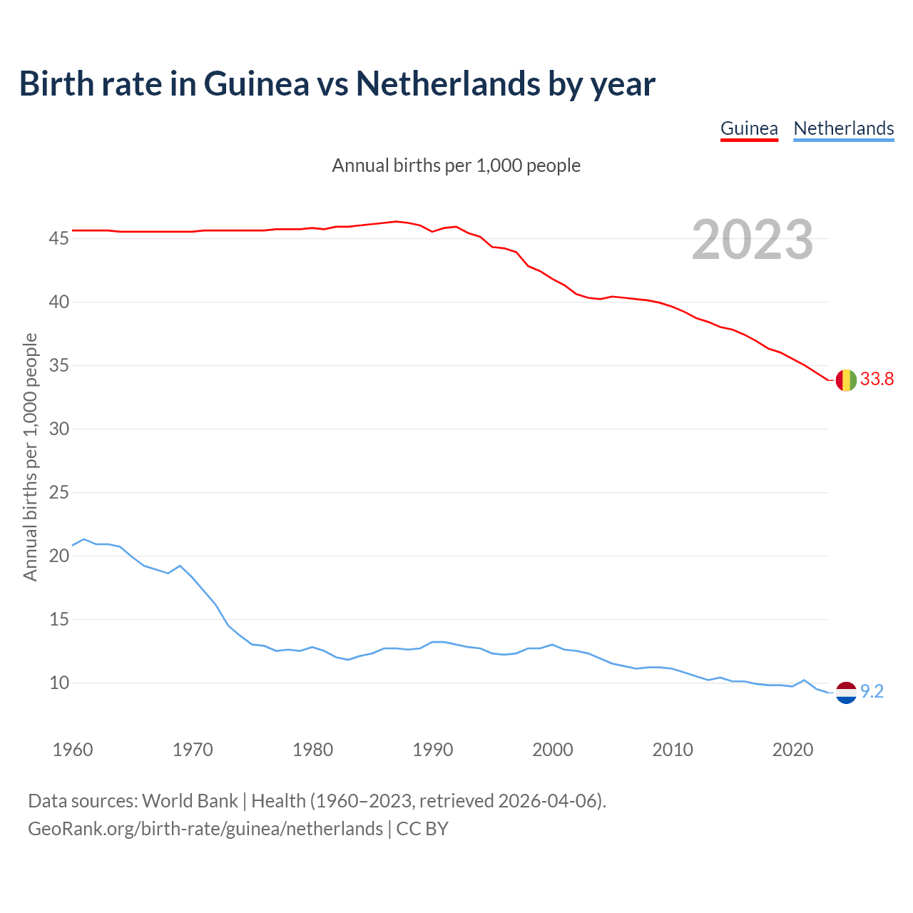 Guinea has an annual birth rate of 33.8 births per 1,000 people, compared to 9.2 for the Netherlands. The average number of children a woman is expected to have during her lifetime — the fertility rate, is 4.22 in Guinea and 1.43 in the Netherlands — 66.1% difference.
