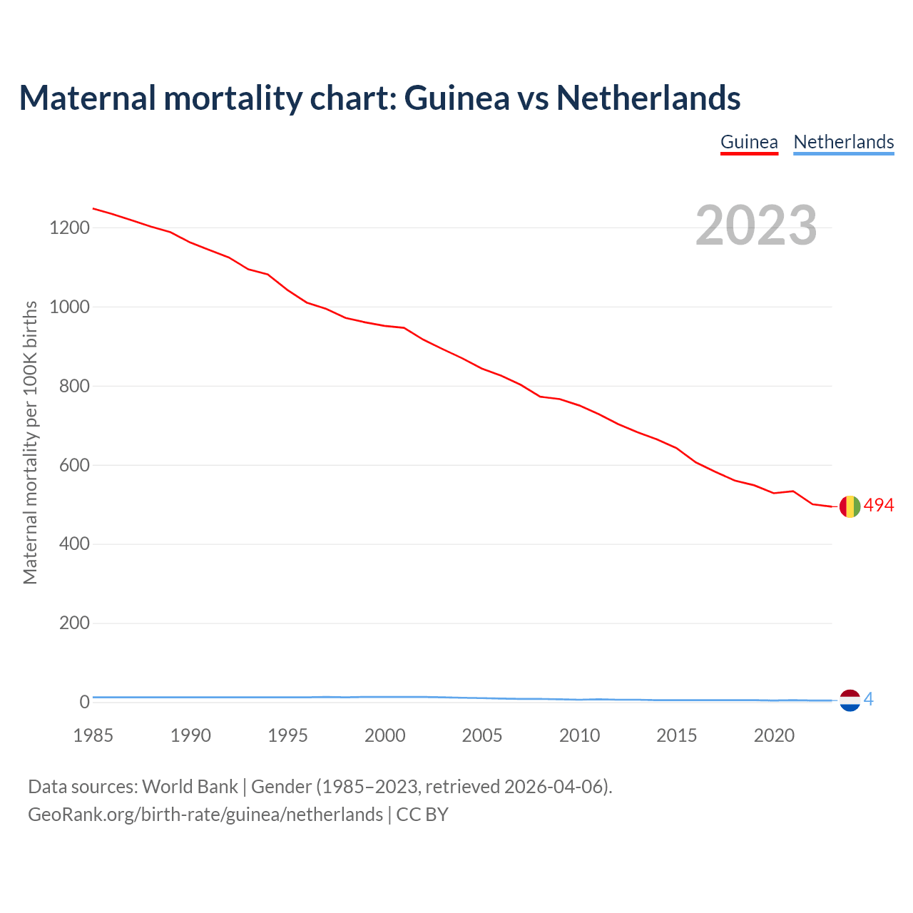 The maternal mortality rate, which is the probability of dying during childbirth or within 42 days of pregnancy termination, is 494 deaths per 100,000 live births in Guinea, compared to 4 deaths in the Netherlands.
