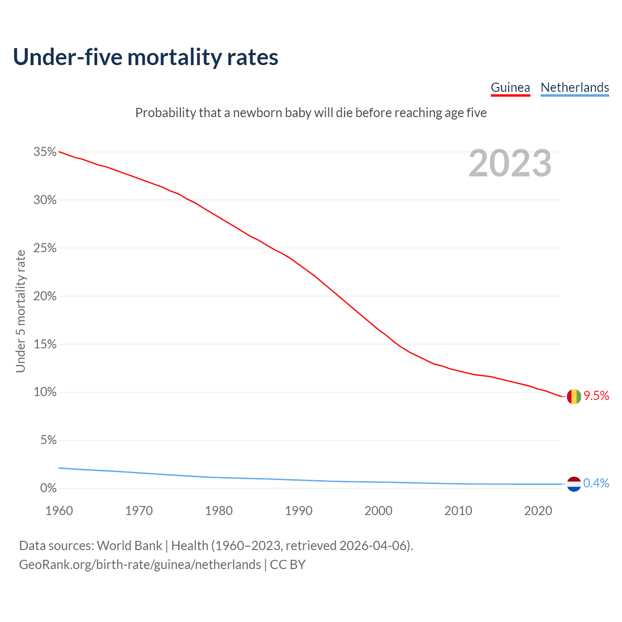 The chance that a newborn baby will die before reaching age five is 9.5% in Guinea and 0.4% in the Netherlands. Above is a chart with historical data on under-five mortality rates.