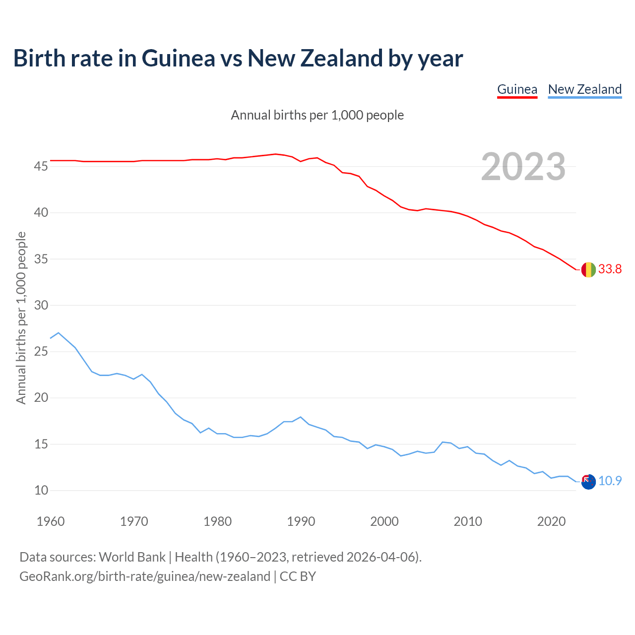 Guinea has an annual birth rate of 33.8 births per 1,000 people, compared to 10.9 for New Zealand. The average number of children a woman is expected to have during her lifetime — the fertility rate, is 4.22 in Guinea and 1.56 in New Zealand — 63% difference.