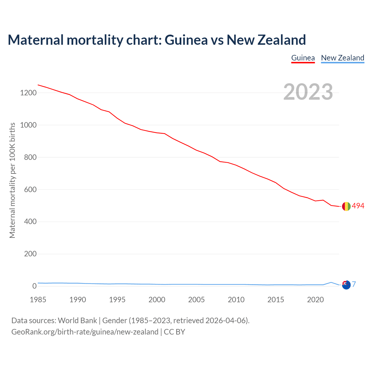 The maternal mortality rate, which is the probability of dying during childbirth or within 42 days of pregnancy termination, is 494 deaths per 100,000 live births in Guinea, compared to 7 deaths in New Zealand.