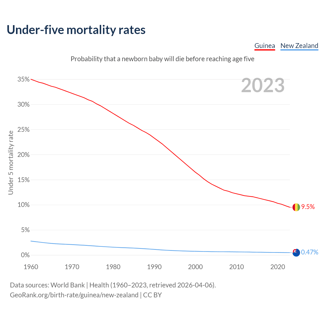 The chance that a newborn baby will die before reaching age five is 9.5% in Guinea and 0.47% in New Zealand. Above is a chart with historical data on under-five mortality rates.