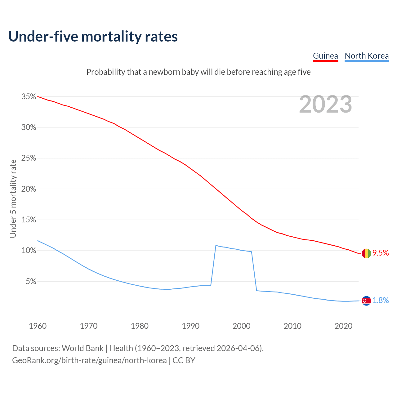 The chance that a newborn baby will die before reaching age five is 9.5% in Guinea and 1.8% in North Korea. Above is a chart with historical data on under-five mortality rates.
